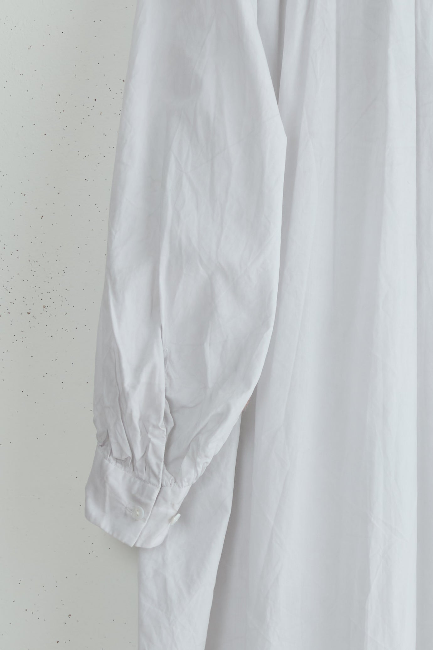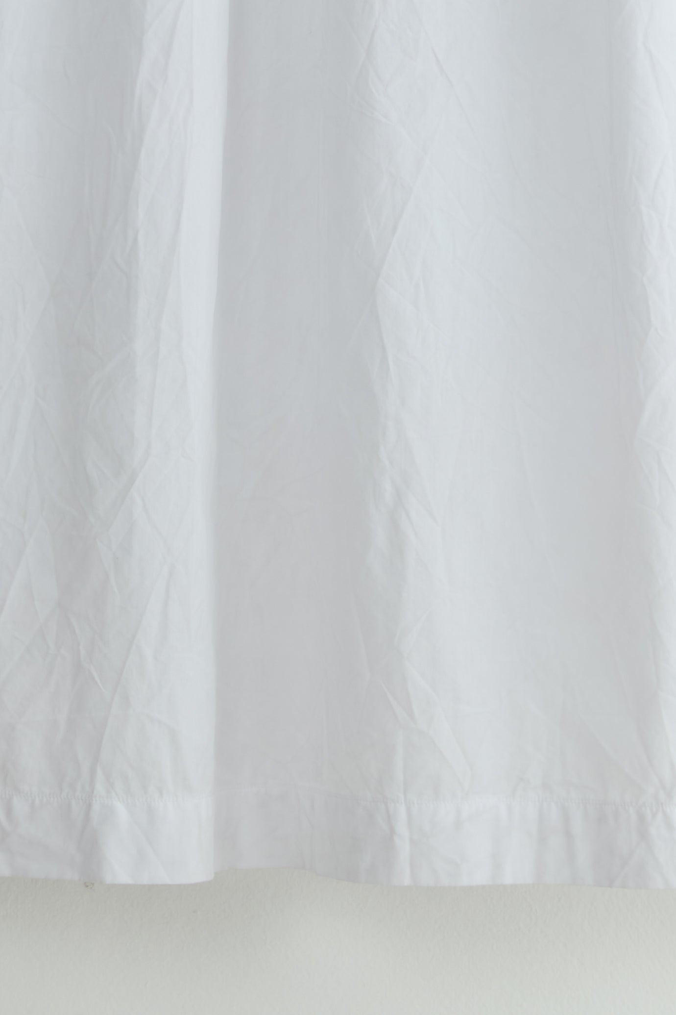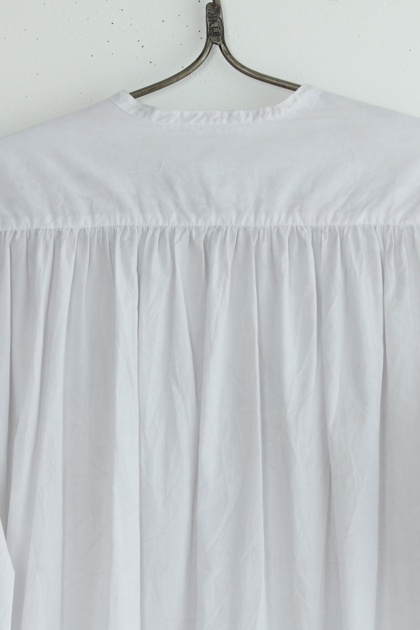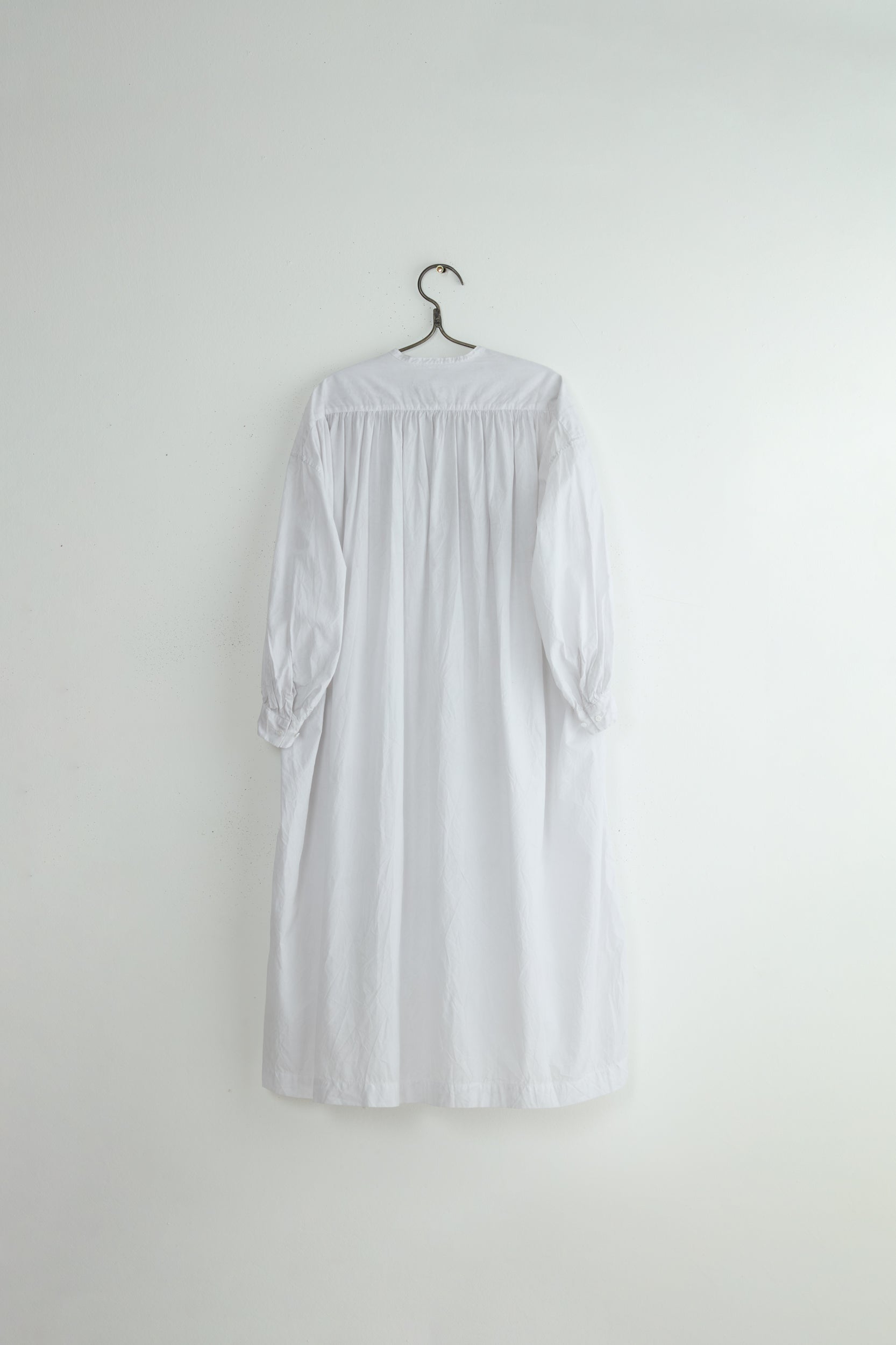 Natural dye lace dress by TOUJOURS. A lightweight tunic dress made from naturally dyed wrinkle paper cotton cloth. Relaxed fit with gathered long sleeves, a round neckline with a button keyhole closure and a wide eyelet lace panel at front, dropped shoulders, side seam pockets, buttoned cuffs and gathered back yoke.