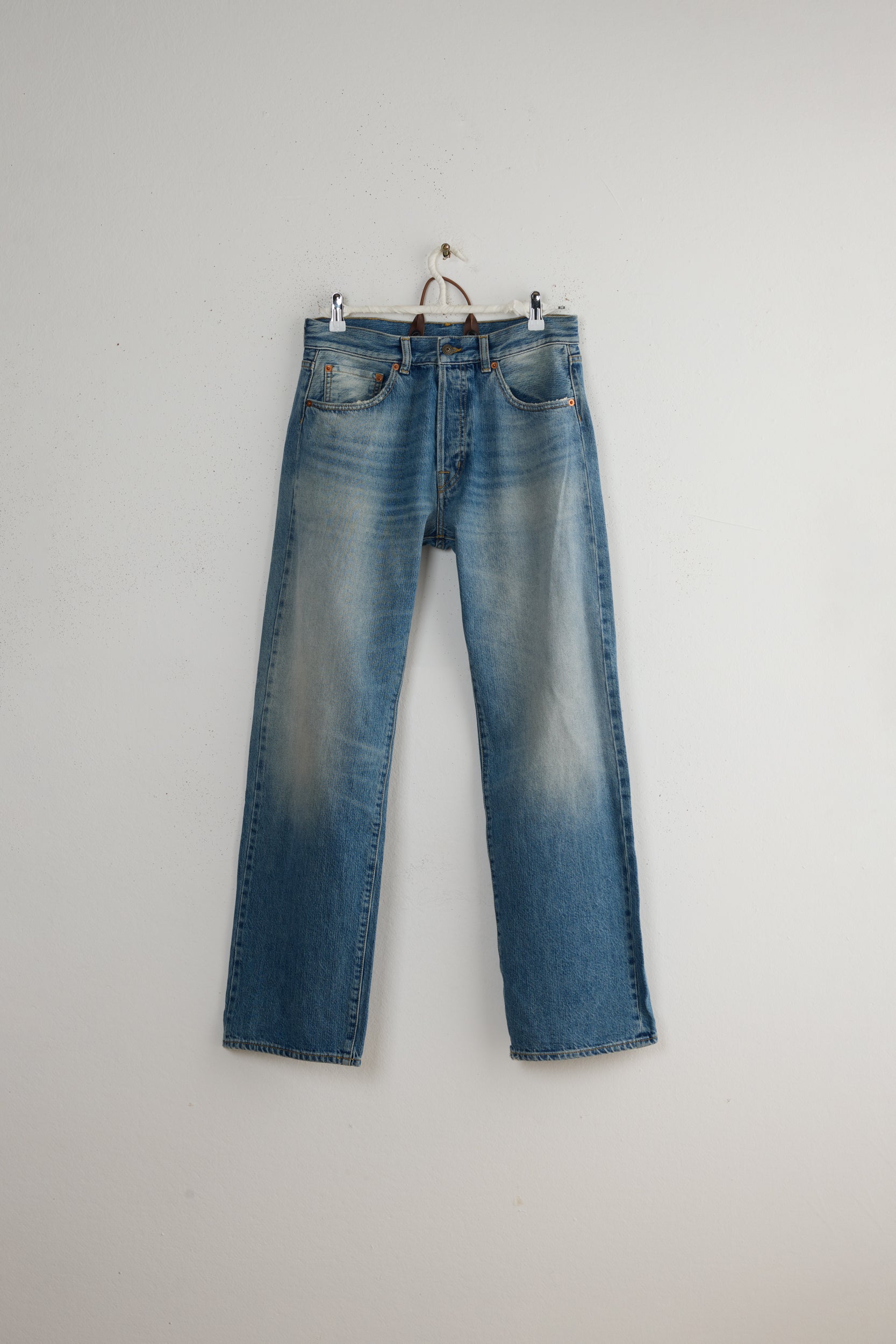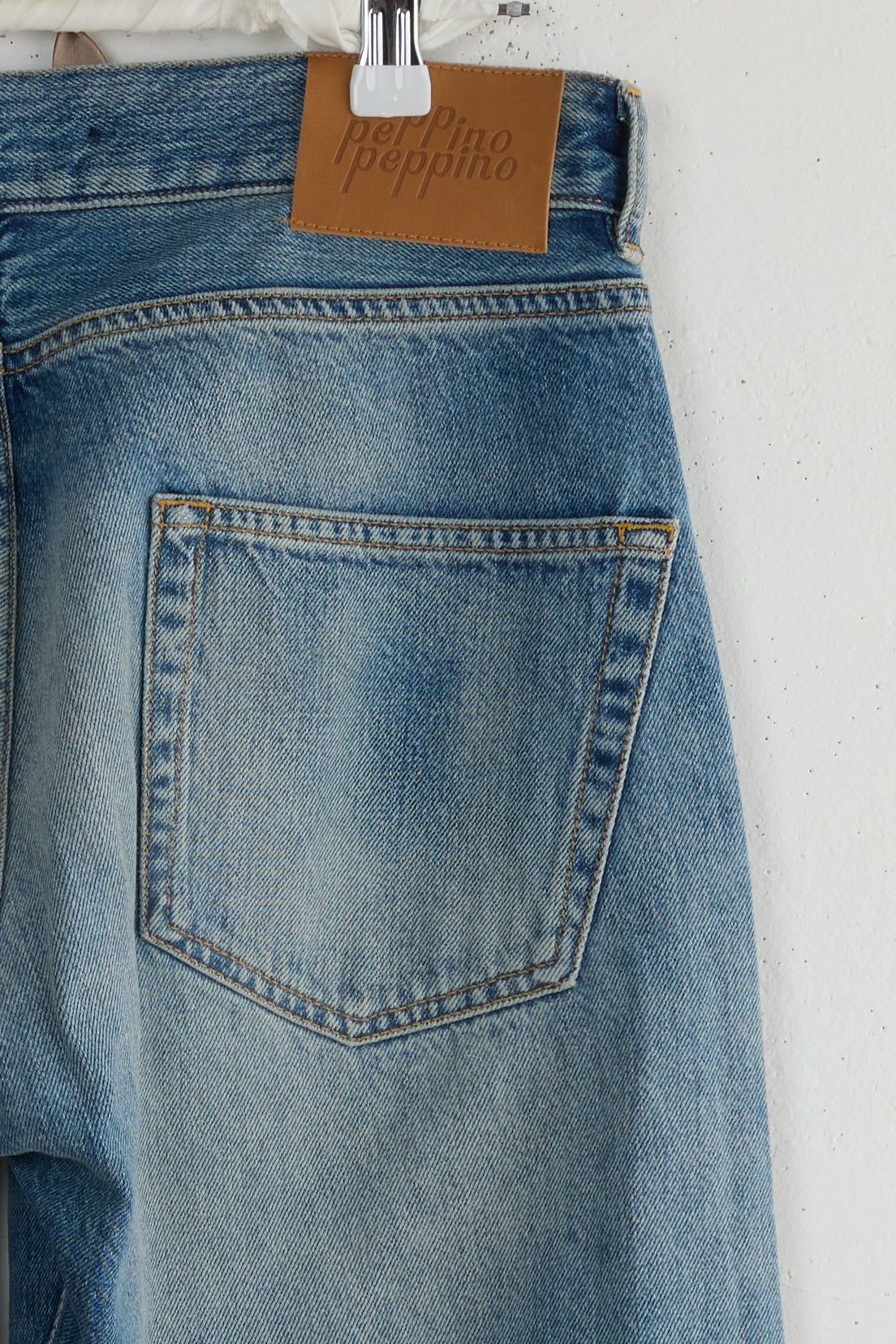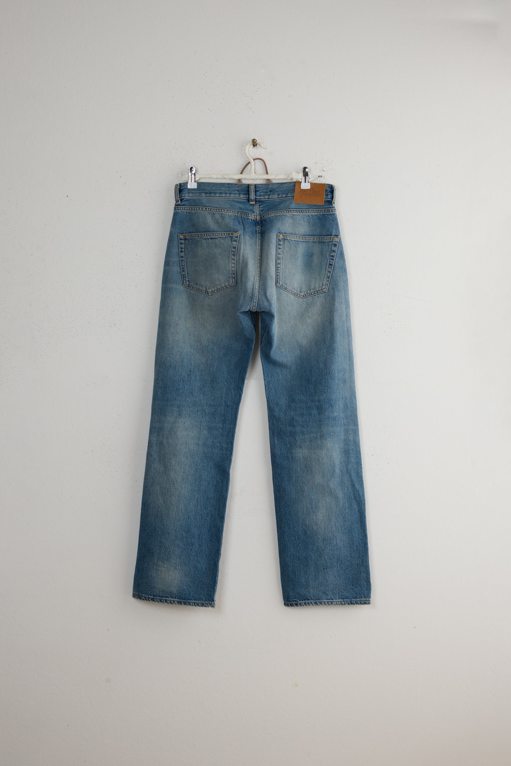 Type 18 by Peppino Peppino. A true Peppino Peppino favorite, these Relaxed Light Blue jeans are a modified iteration of a classic 5 pockets, featuring details taken from 50's and 60's vintage denim pants. Oversize fit, loose silhouette that sits at the hip for a cool, laid-back look. To be worn rolled up to show the selvedge detail at the outseam. Beautifully washed and softened 12.5oz denim finished with a corn vegan leather patch.