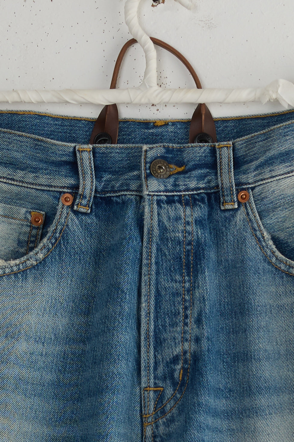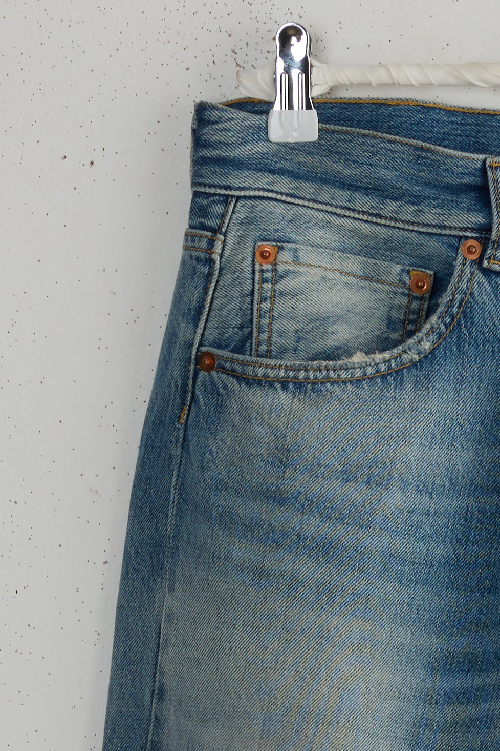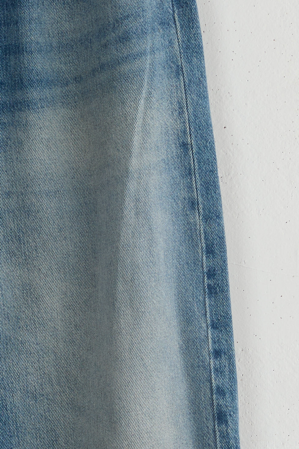 Type 18 by Peppino Peppino. A true Peppino Peppino favorite, these Relaxed Light Blue jeans are a modified iteration of a classic 5 pockets, featuring details taken from 50's and 60's vintage denim pants. Oversize fit, loose silhouette that sits at the hip for a cool, laid-back look. To be worn rolled up to show the selvedge detail at the outseam. Beautifully washed and softened 12.5oz denim finished with a corn vegan leather patch.