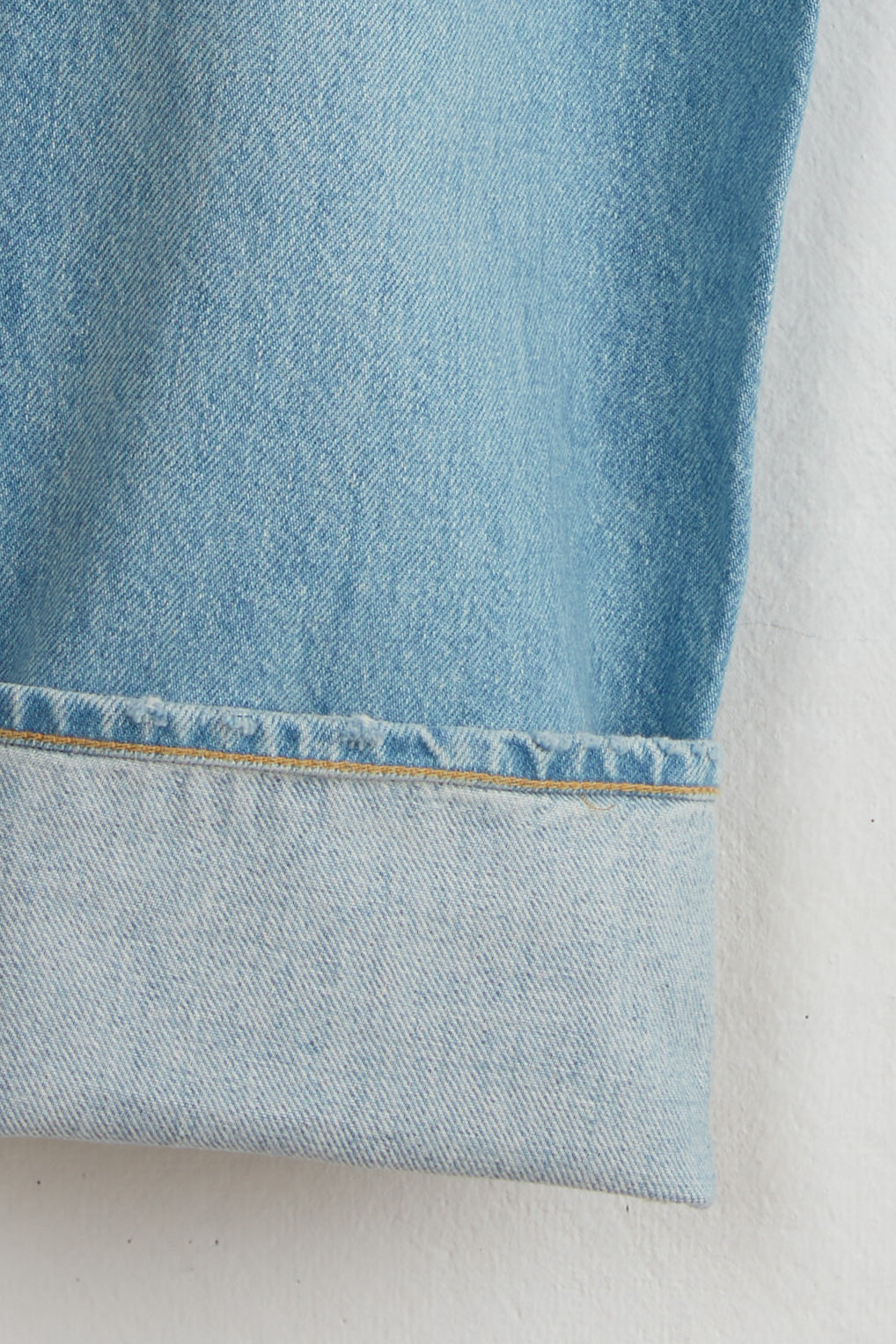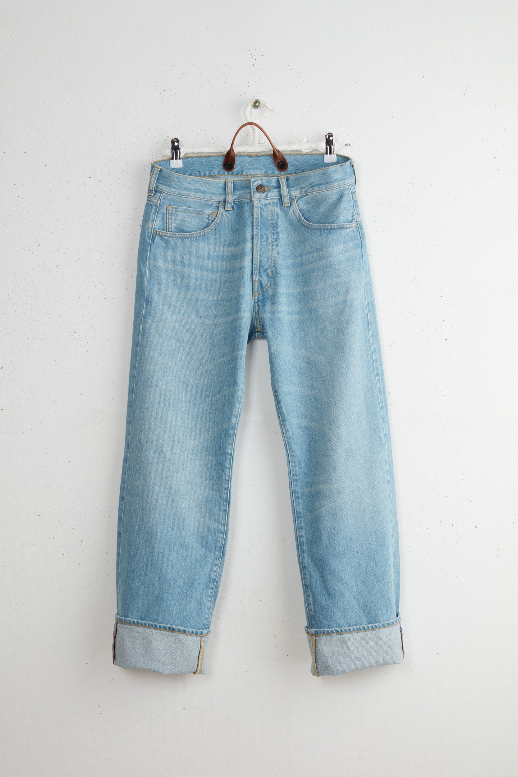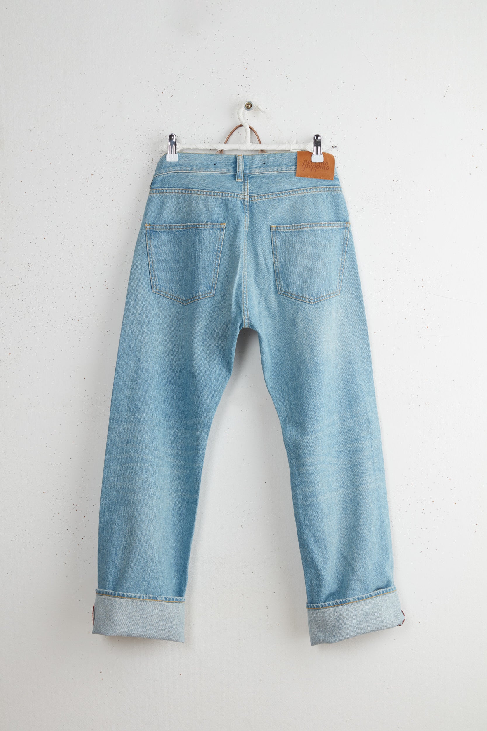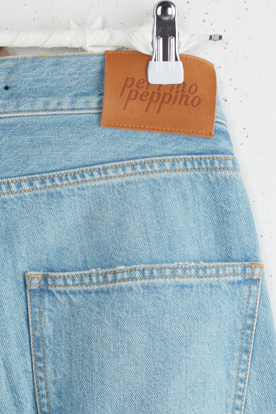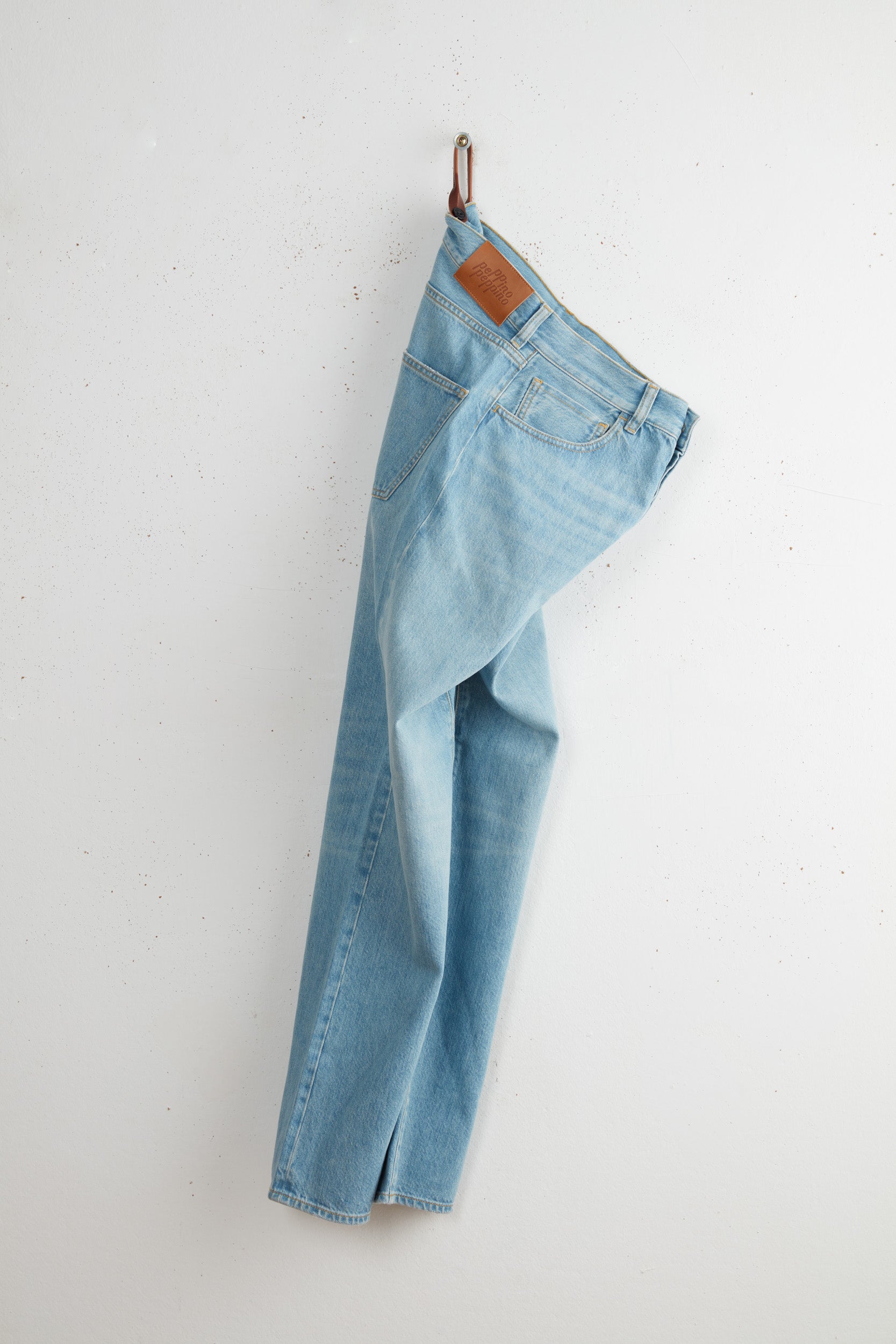 Type 18 by PeppinoPeppino. A true PeppinoPeppino favorite, these Relaxed Light Blue jeans are a modified iteration of a classic 5 pockets, featuring details taken from 50's and 60's vintage denim pants. Oversize fit, loose silhouette that sits at the hip for a cool, laid-back look. To be worn rolled up to show the selvedge detail at the outseam. Beautifully washed and softened 12.5oz denim finished with a corn vegan leather patch.