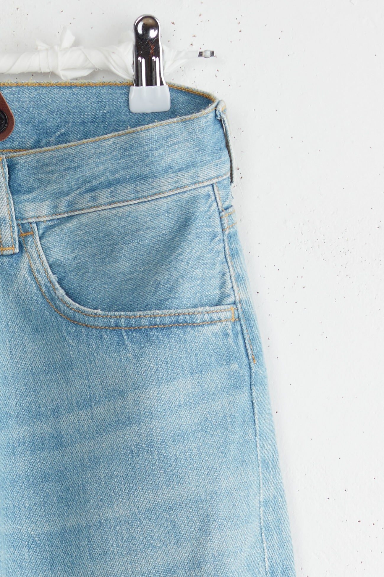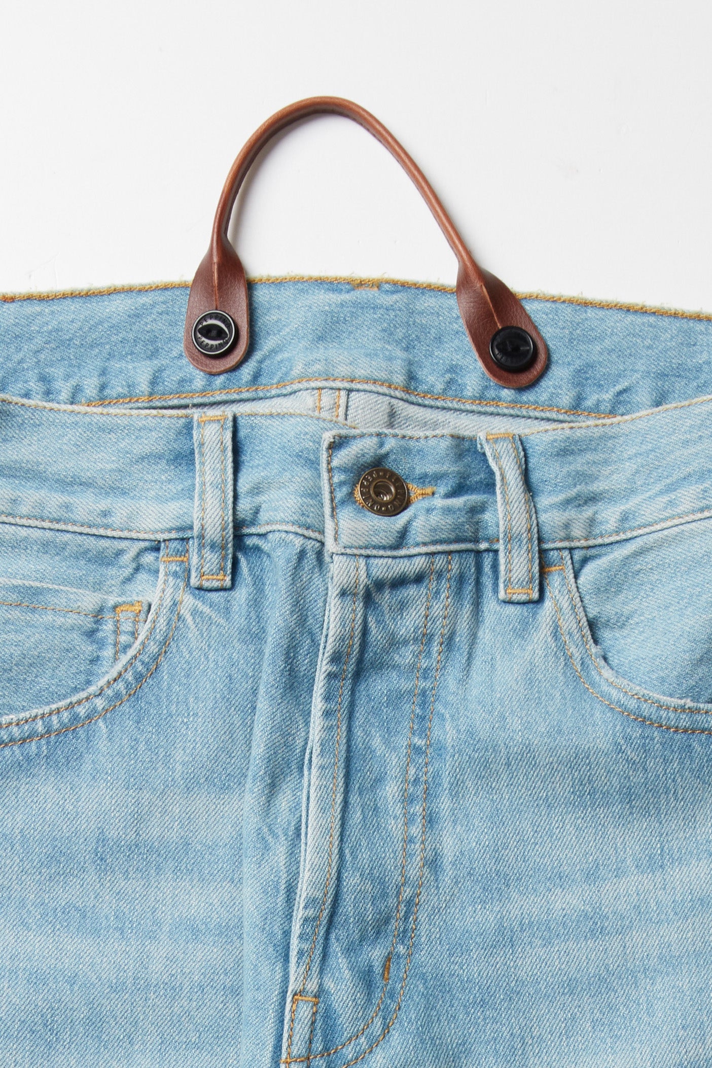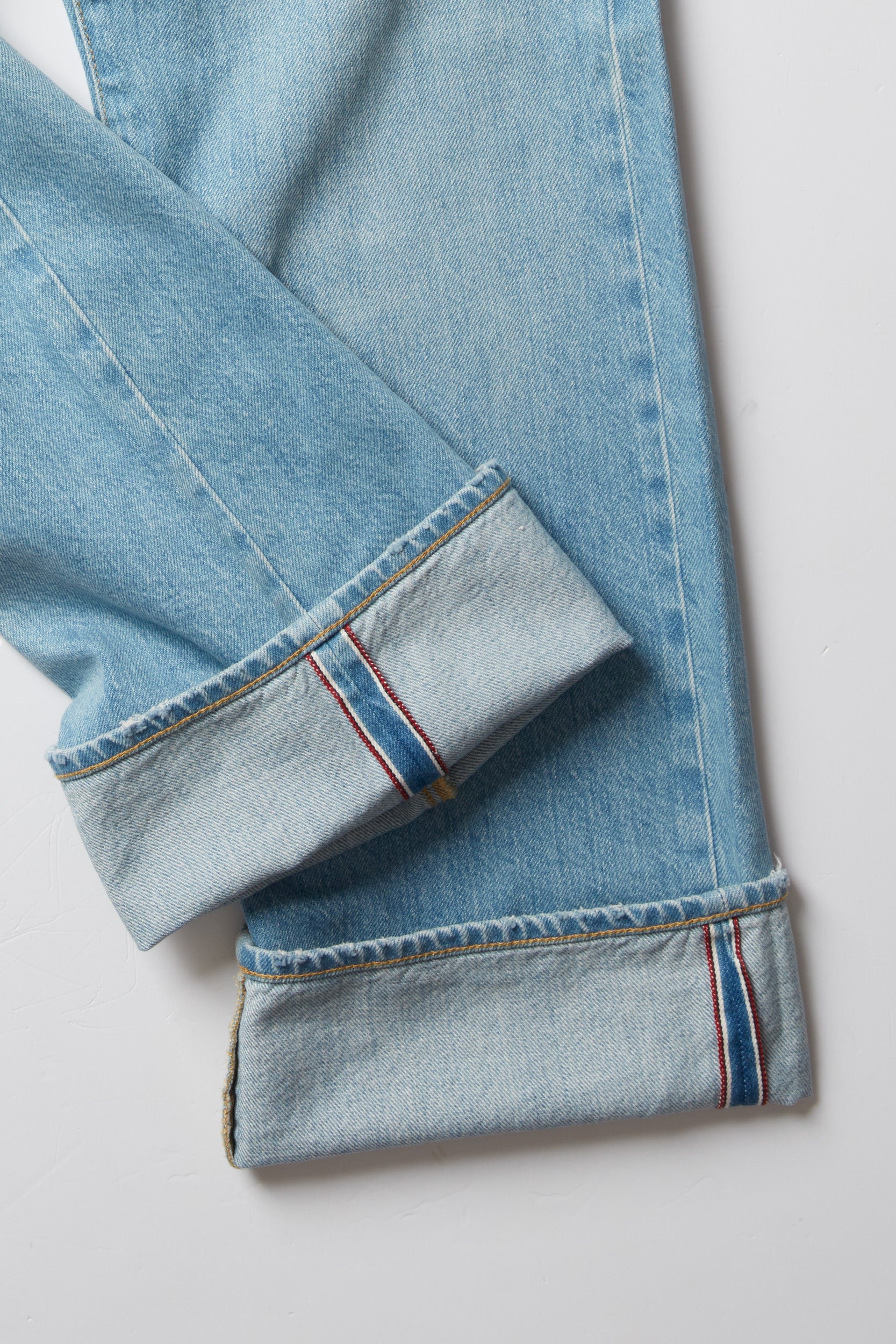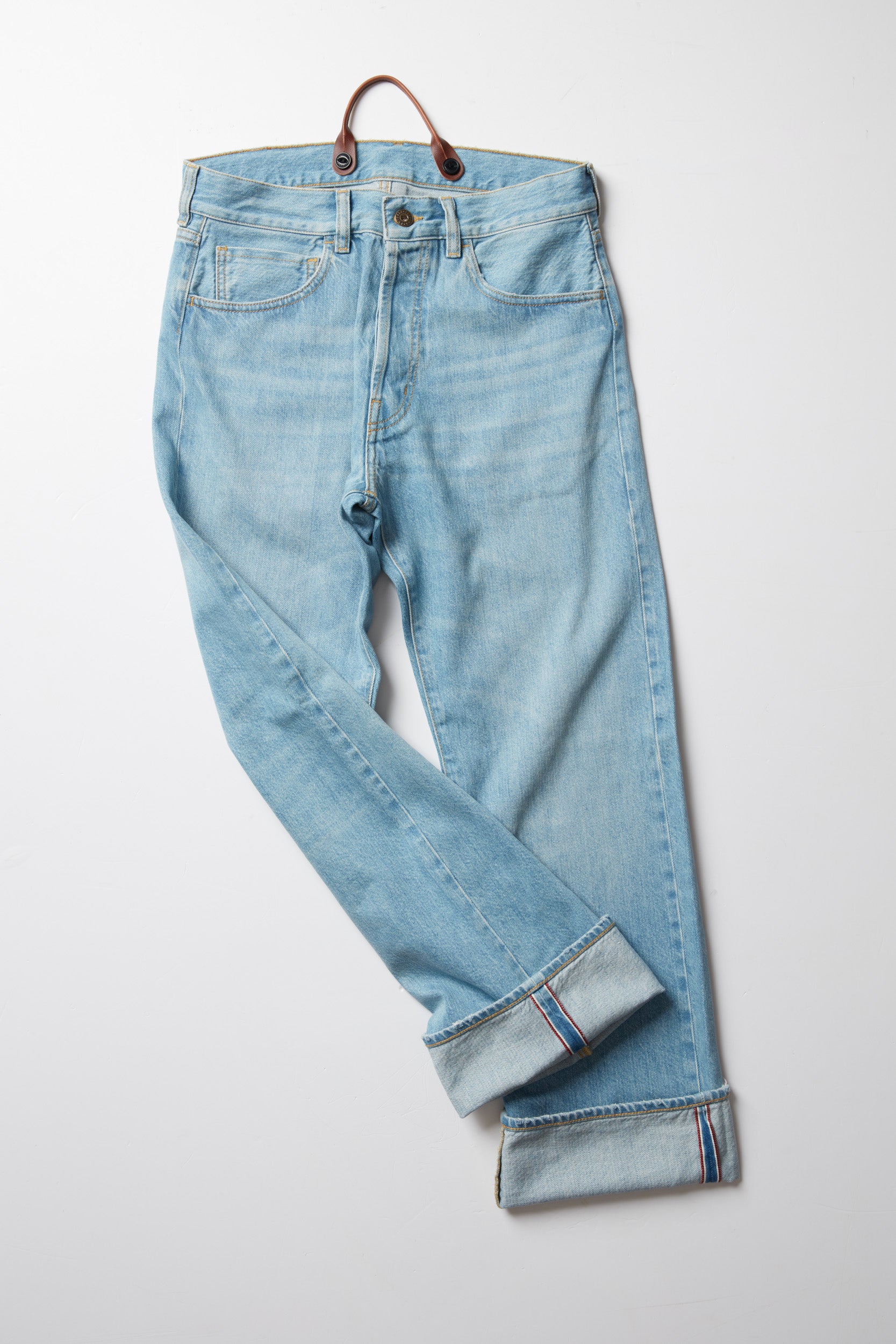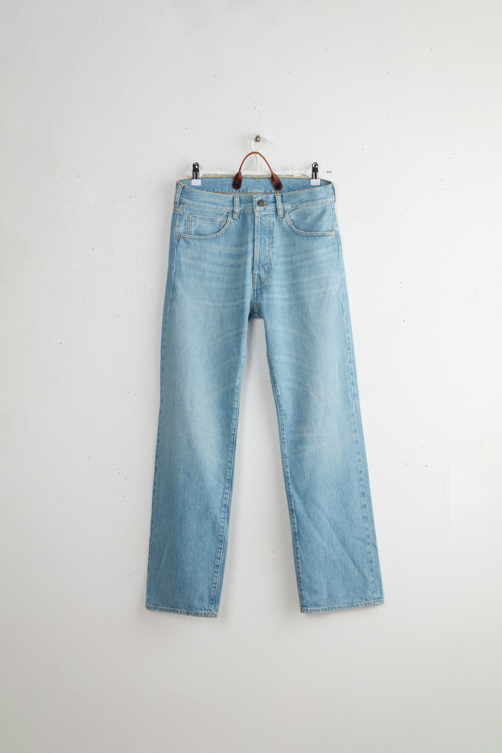 Type 18 by PeppinoPeppino. A true PeppinoPeppino favorite, these Relaxed Light Blue jeans are a modified iteration of a classic 5 pockets, featuring details taken from 50's and 60's vintage denim pants. Oversize fit, loose silhouette that sits at the hip for a cool, laid-back look. To be worn rolled up to show the selvedge detail at the outseam. Beautifully washed and softened 12.5oz denim finished with a corn vegan leather patch.