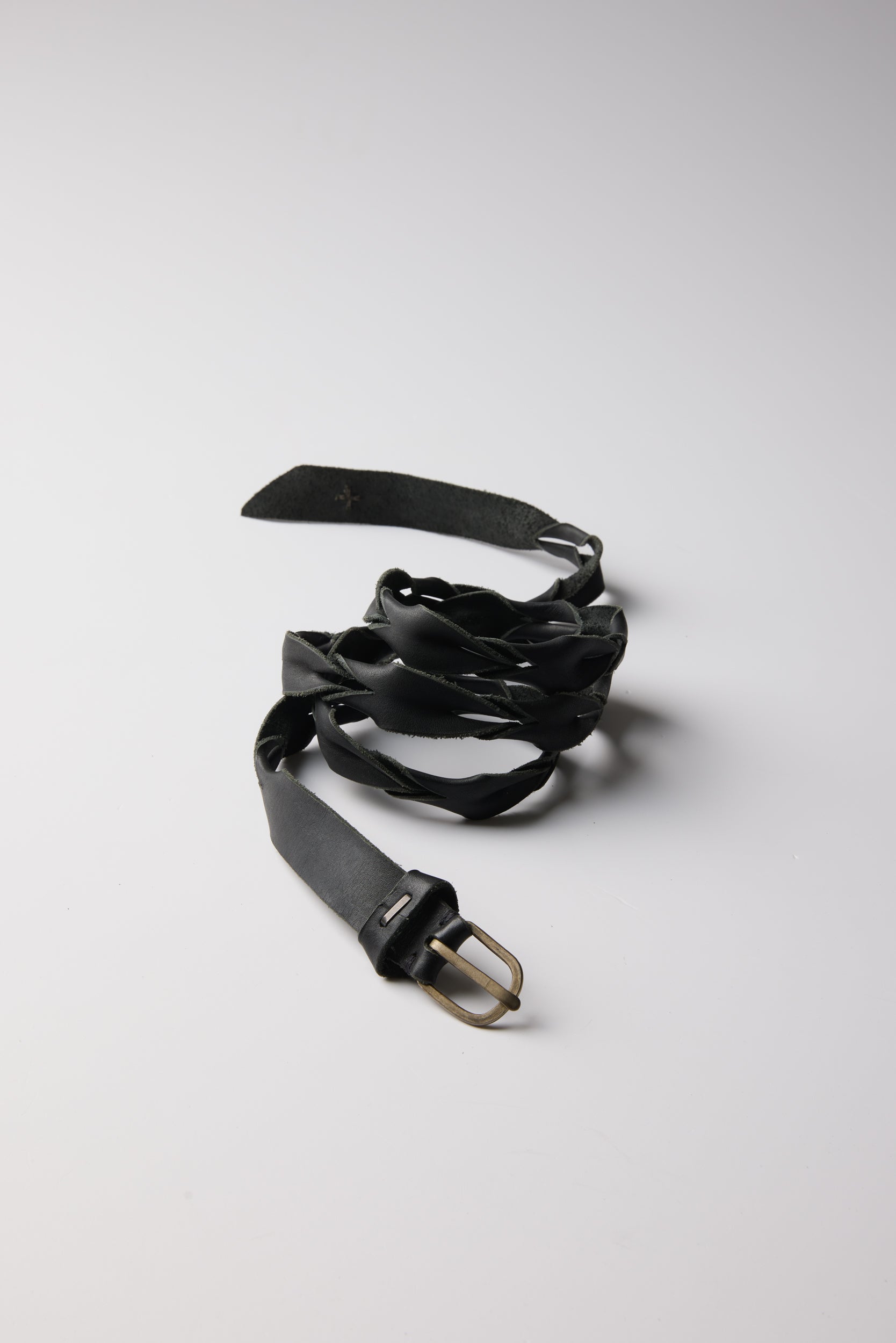 ma+ U buckle braided belt. An artfully made cow leather belt made by folding and twisting the material to a braid like form. It has a U shaped sterling silver buckle and the signature ma+ sterling silver cross on the tail.