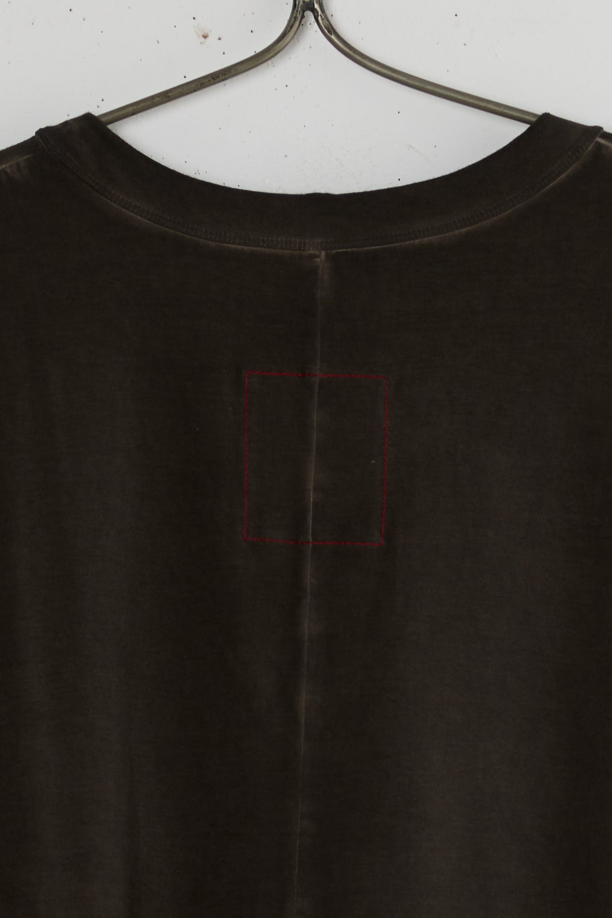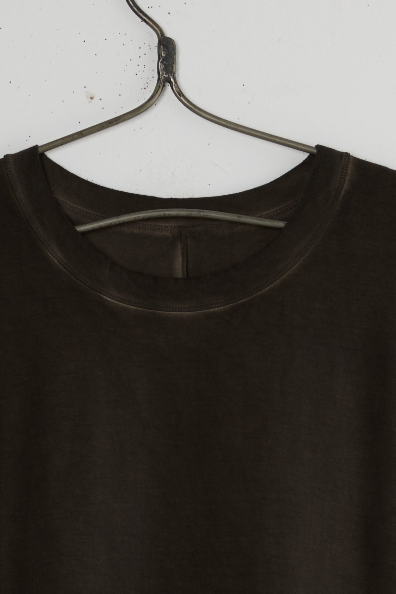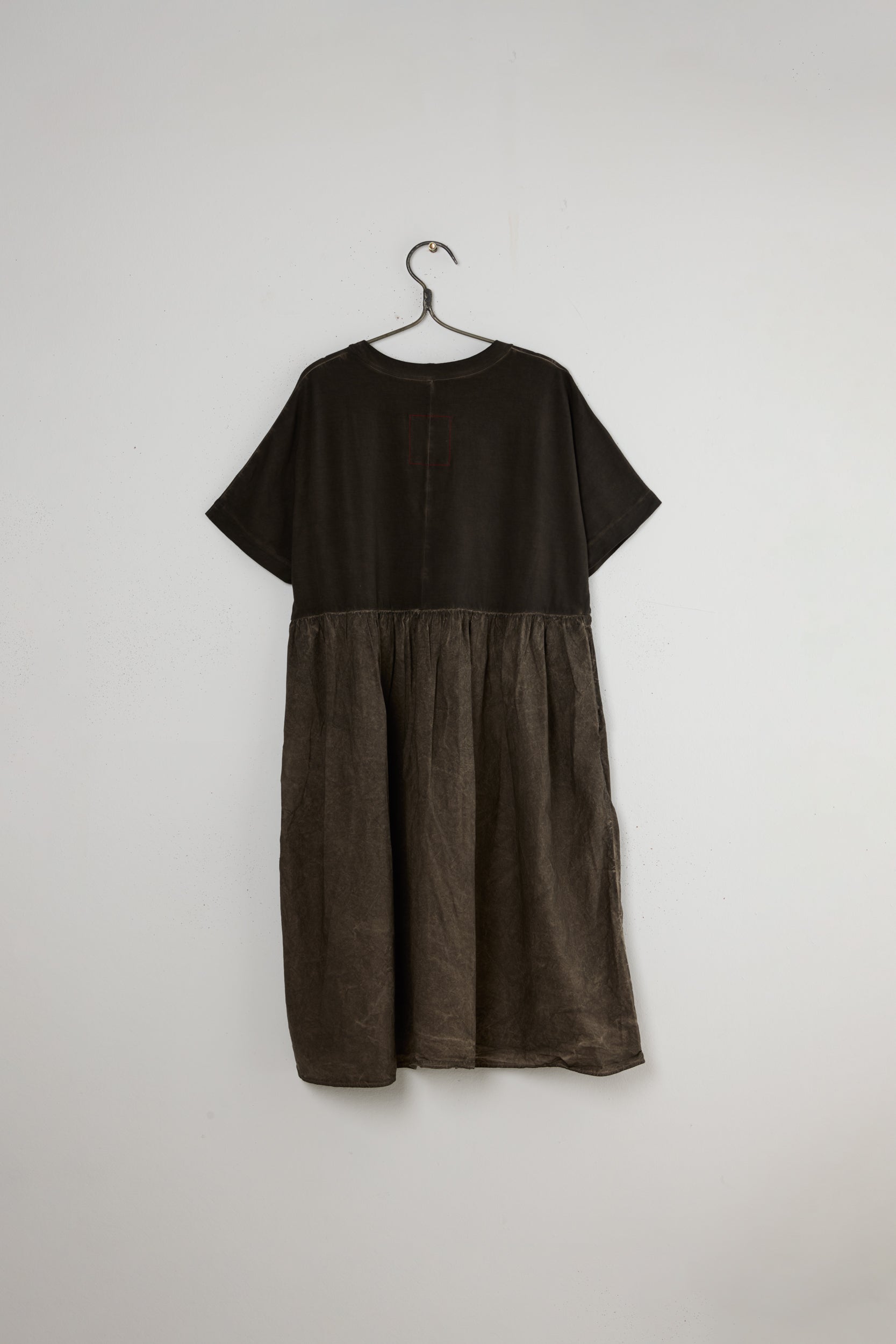 Dana dress from the house of Chinse designer Uma Wang. a light-weight oversized T-shirt dress made with a dual fabric construction of two types of cotton. A boxy fit and mid-shin length with a round neckline, a gathered crisp cotton skirt with side seam Pockets. faded uneven natural coloring.