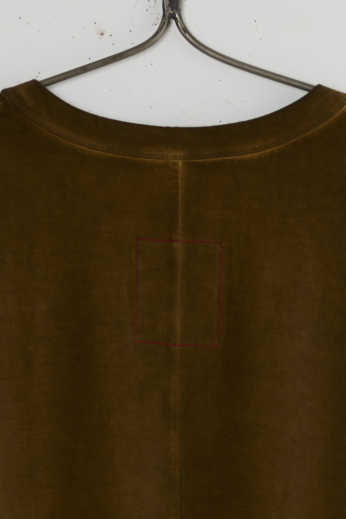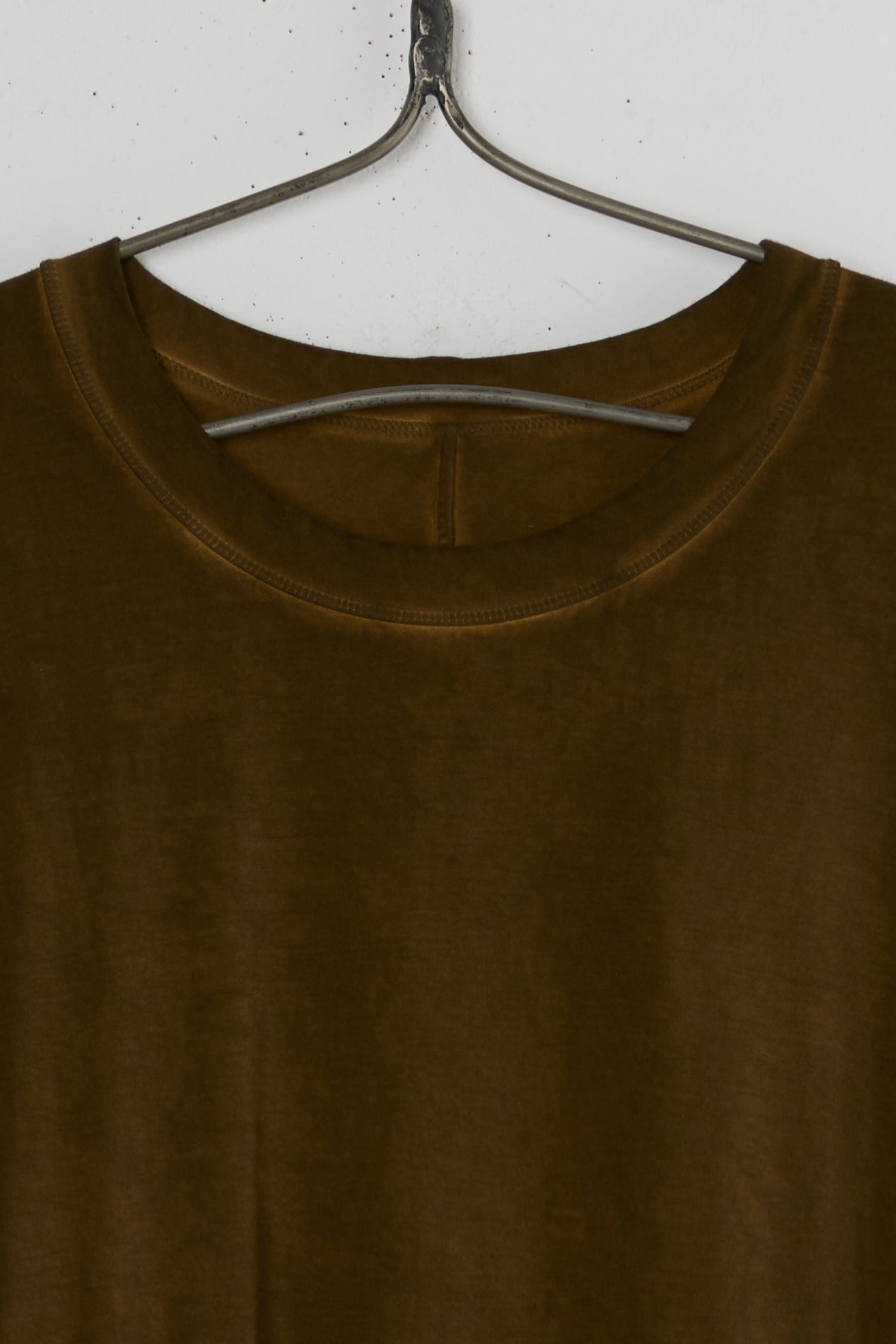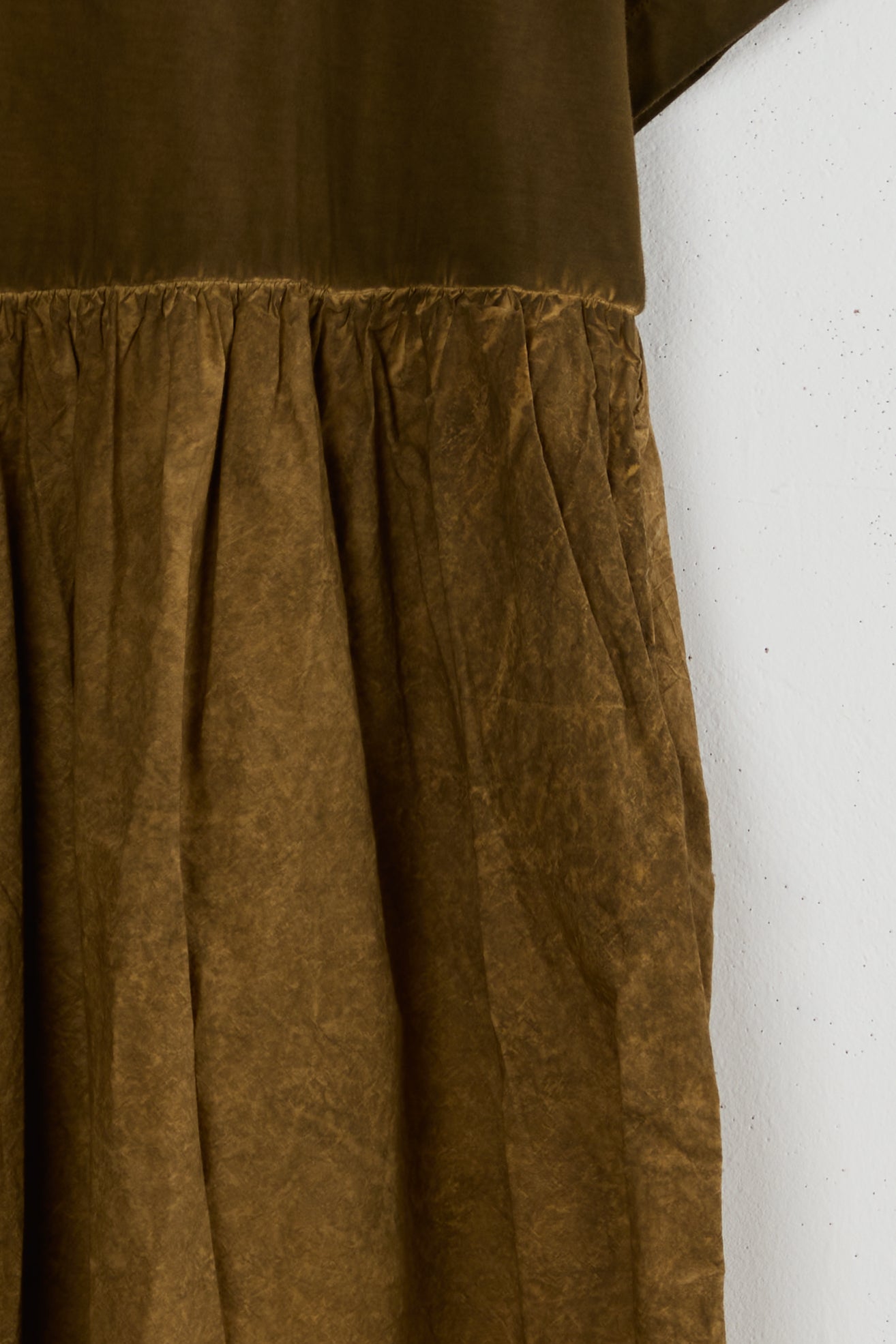 Dana dress from the house of Chinse designer Uma Wang. a light-weight oversized T-shirt dress made with a dual fabric construction of two types of cotton. A boxy fit and mid-shin length with a round neckline, a gathered crisp cotton skirt with side seam Pockets. faded uneven natural coloring.