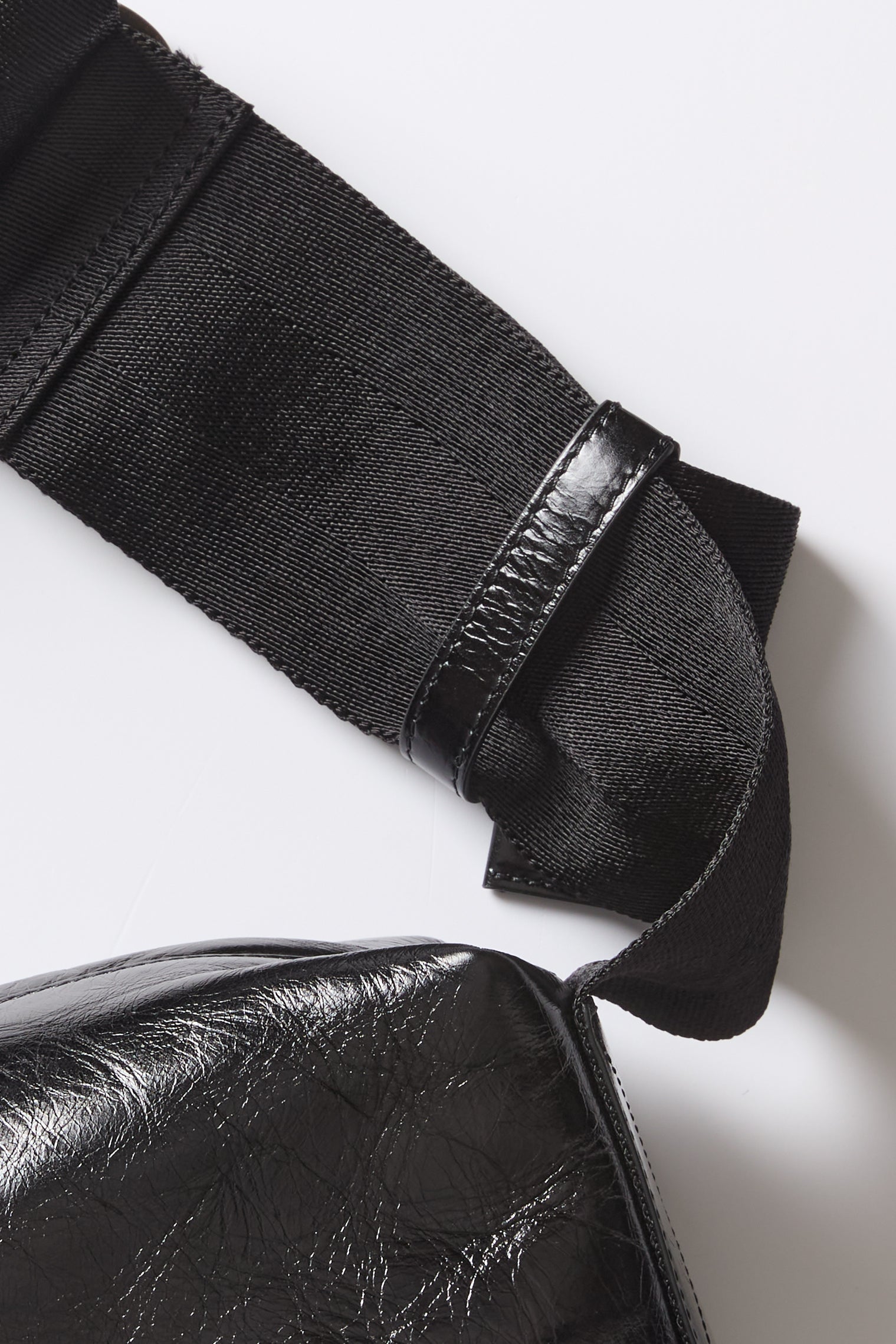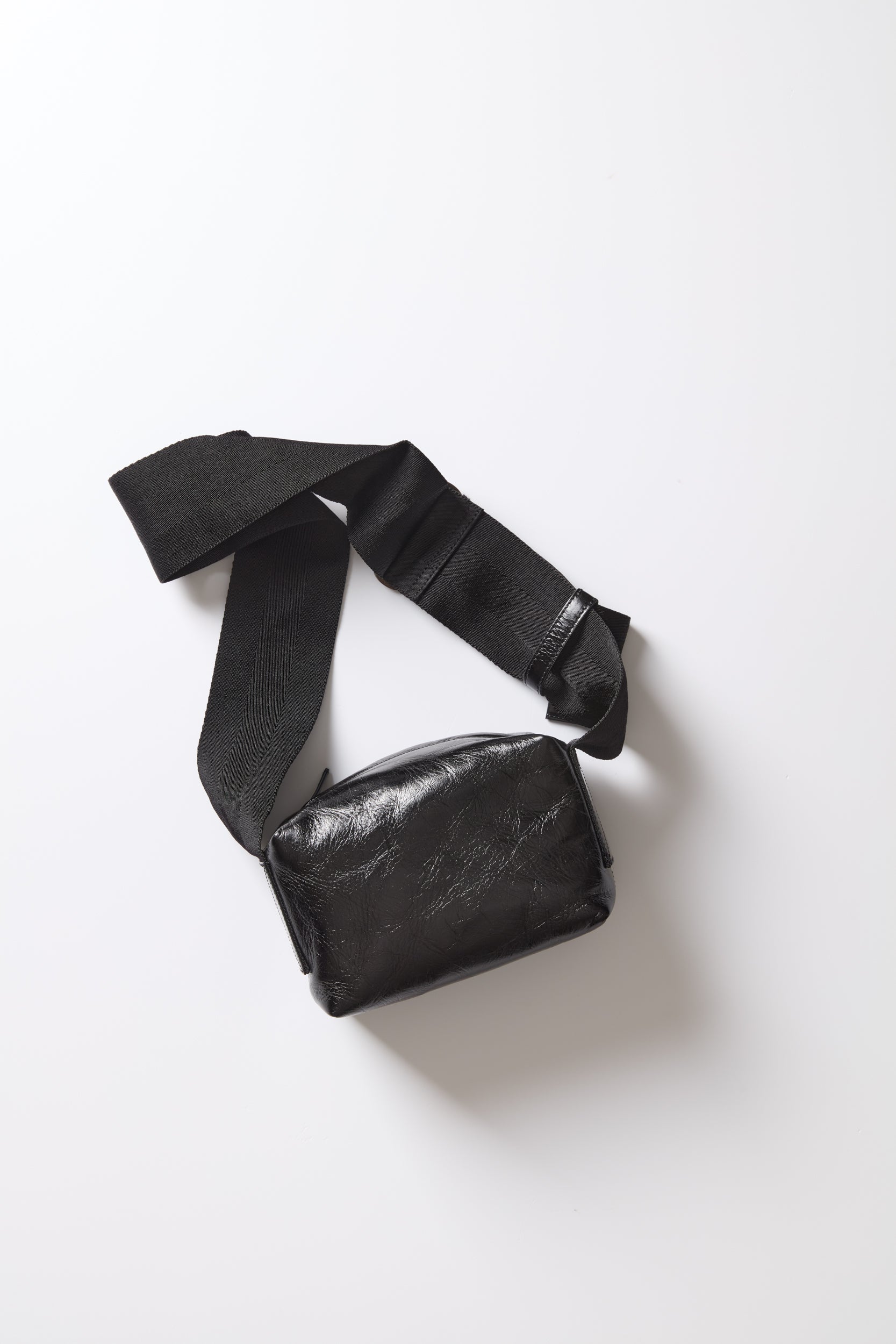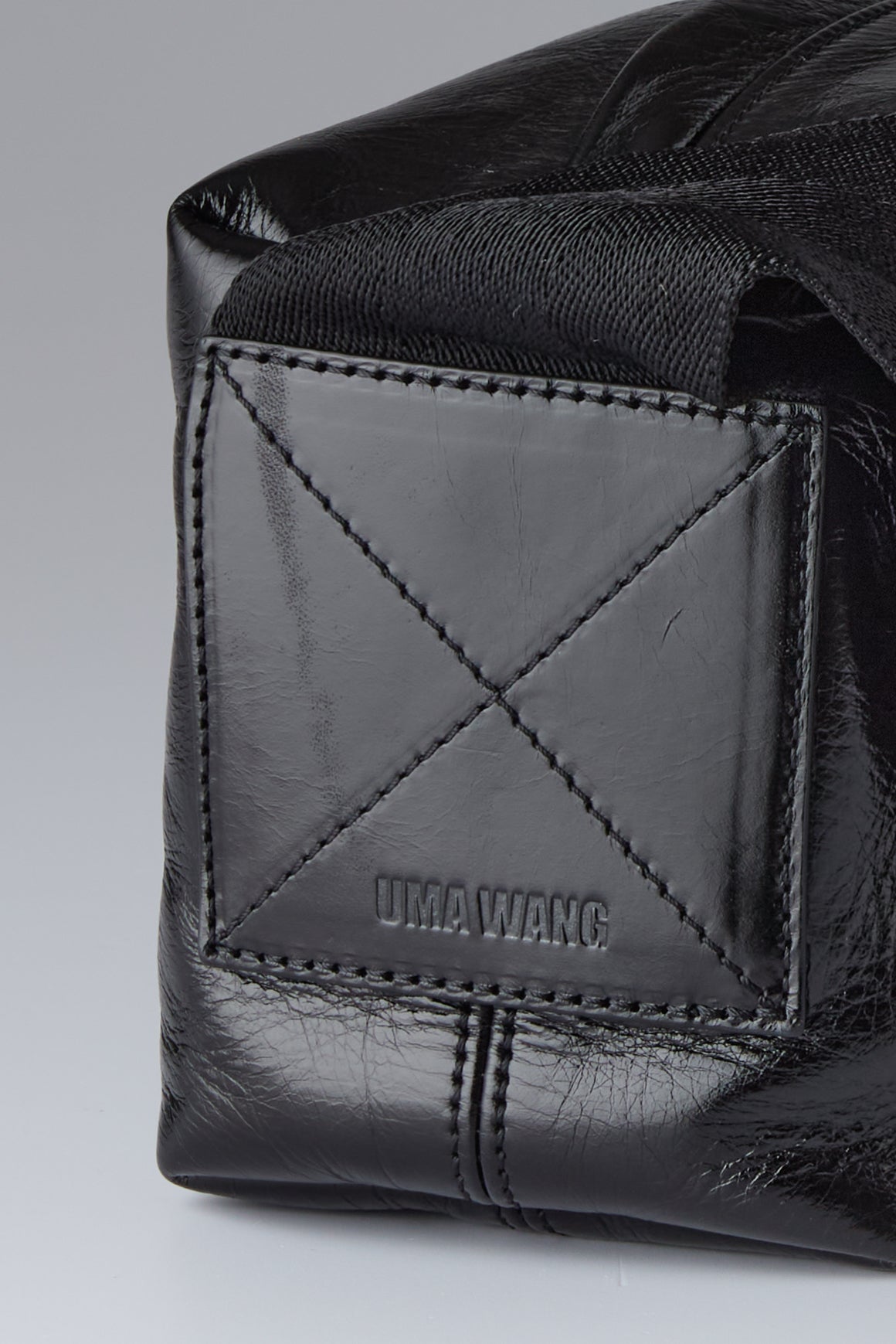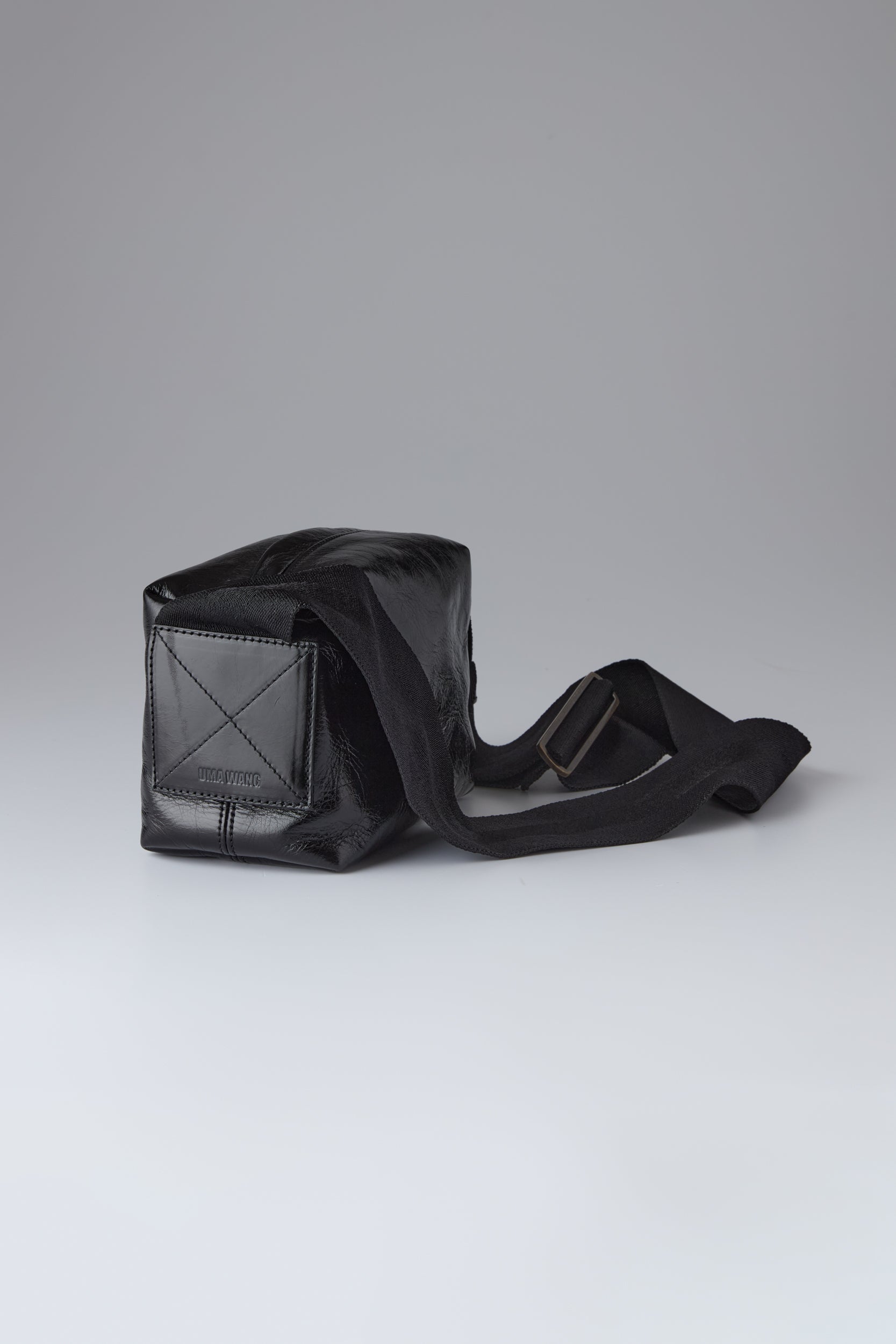 Tofu bag by Chinese designer Uma Wang. Rectangular calf leather Bag with a light texture. A hidden zip fastening on top, striped lining, small inner pocket, wide single shoulder textile strap with a buckle for adjusting the length, embossed logo on the front. Dimensions: 24 x 22 x 11 cm