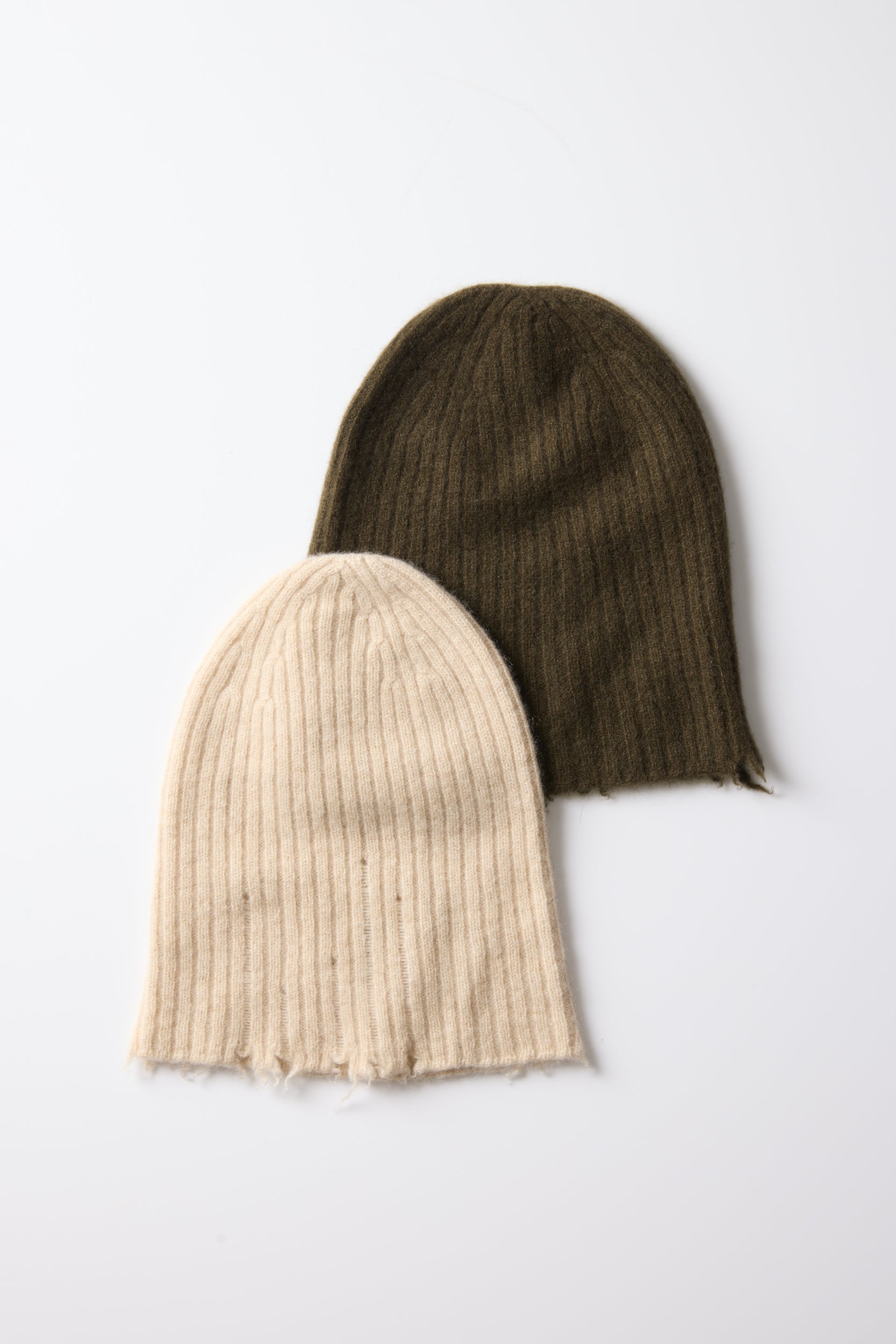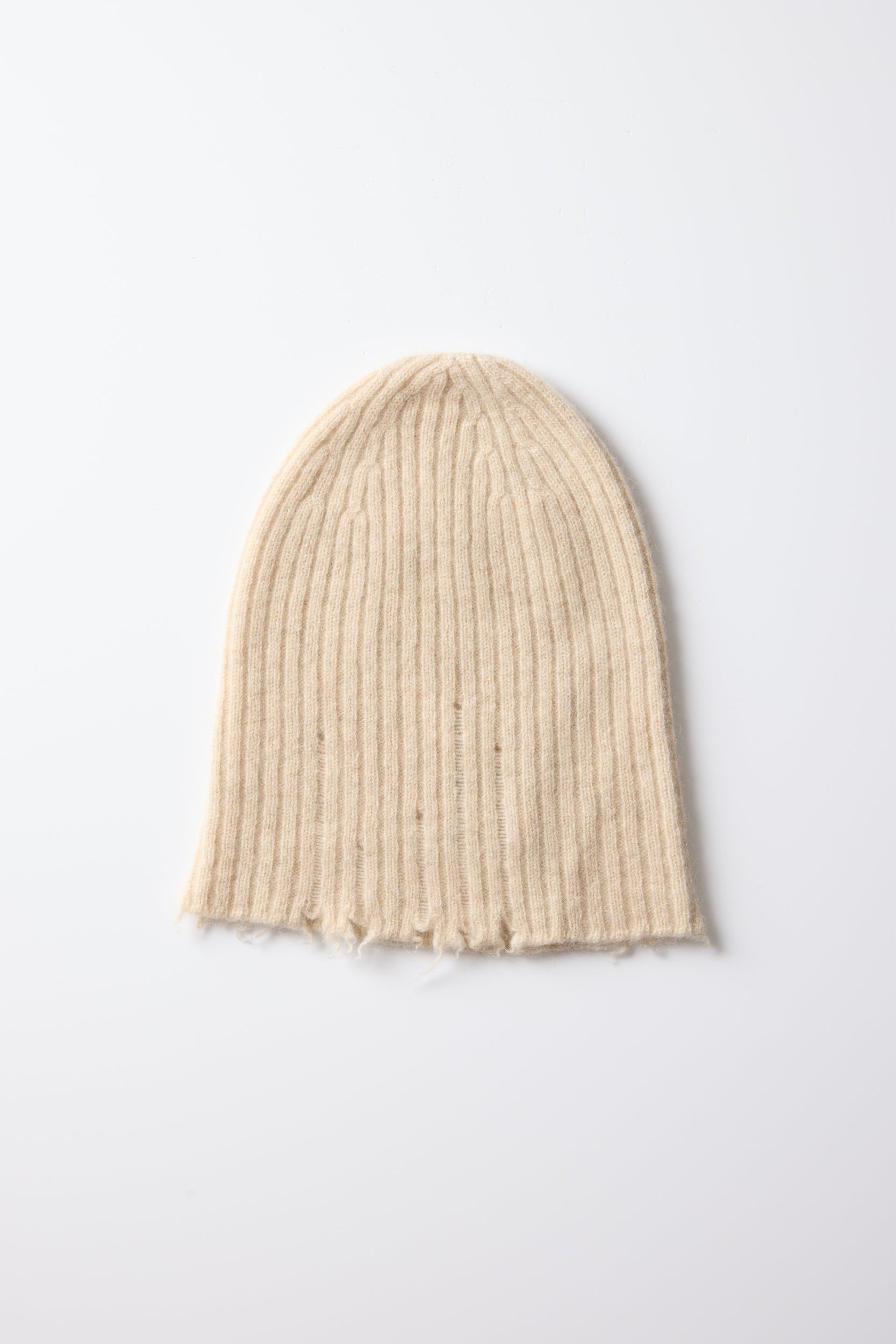Soft hat from house of Chinese designer Uma wang. A soft, lightweight beanie hat made from 100% cashmere. Ribbed design with frayed edges .