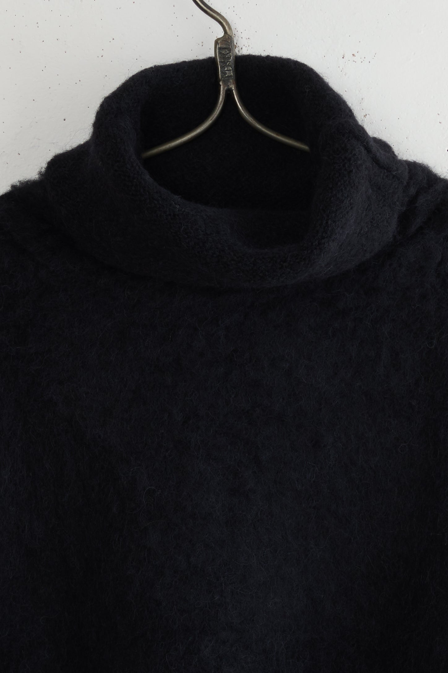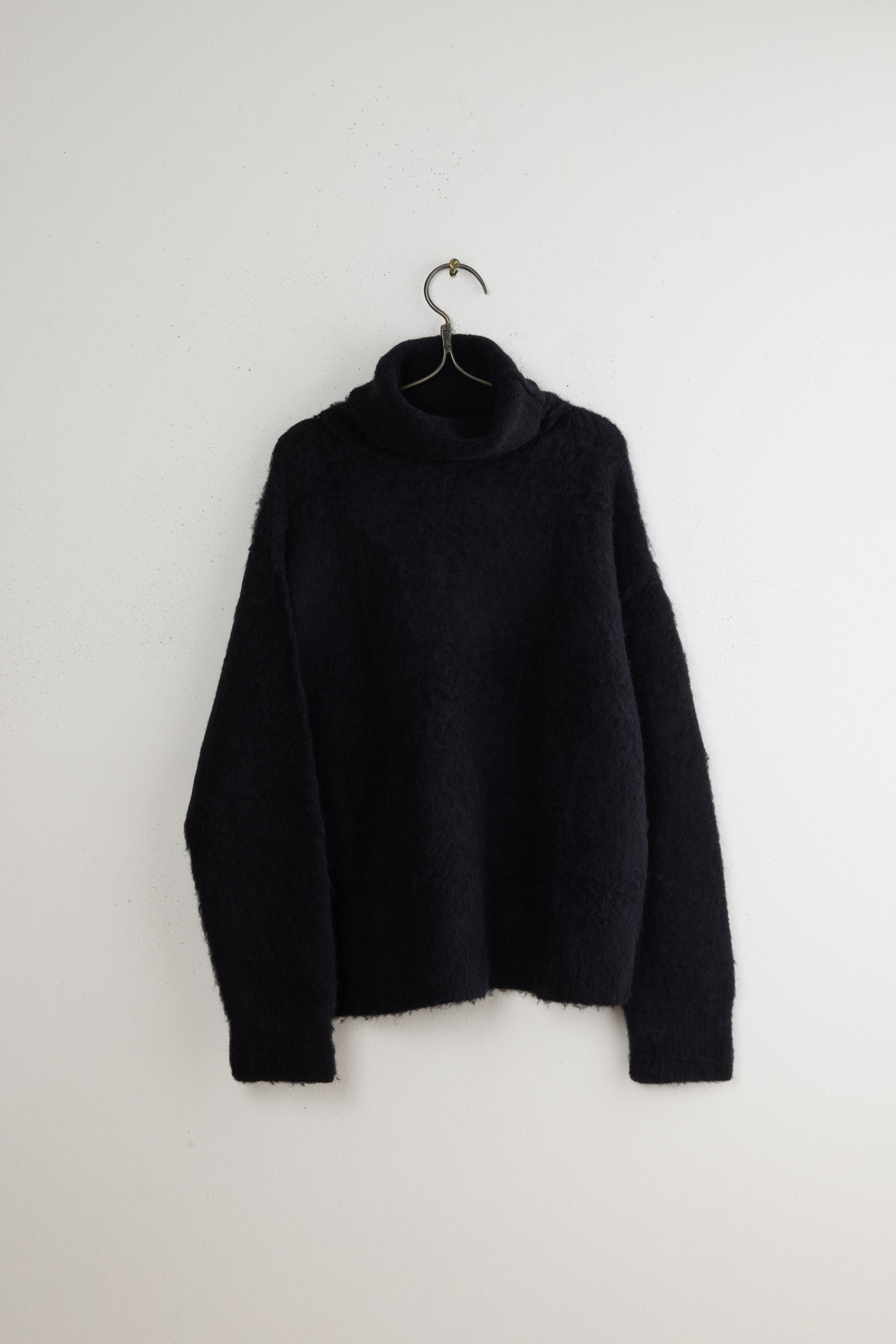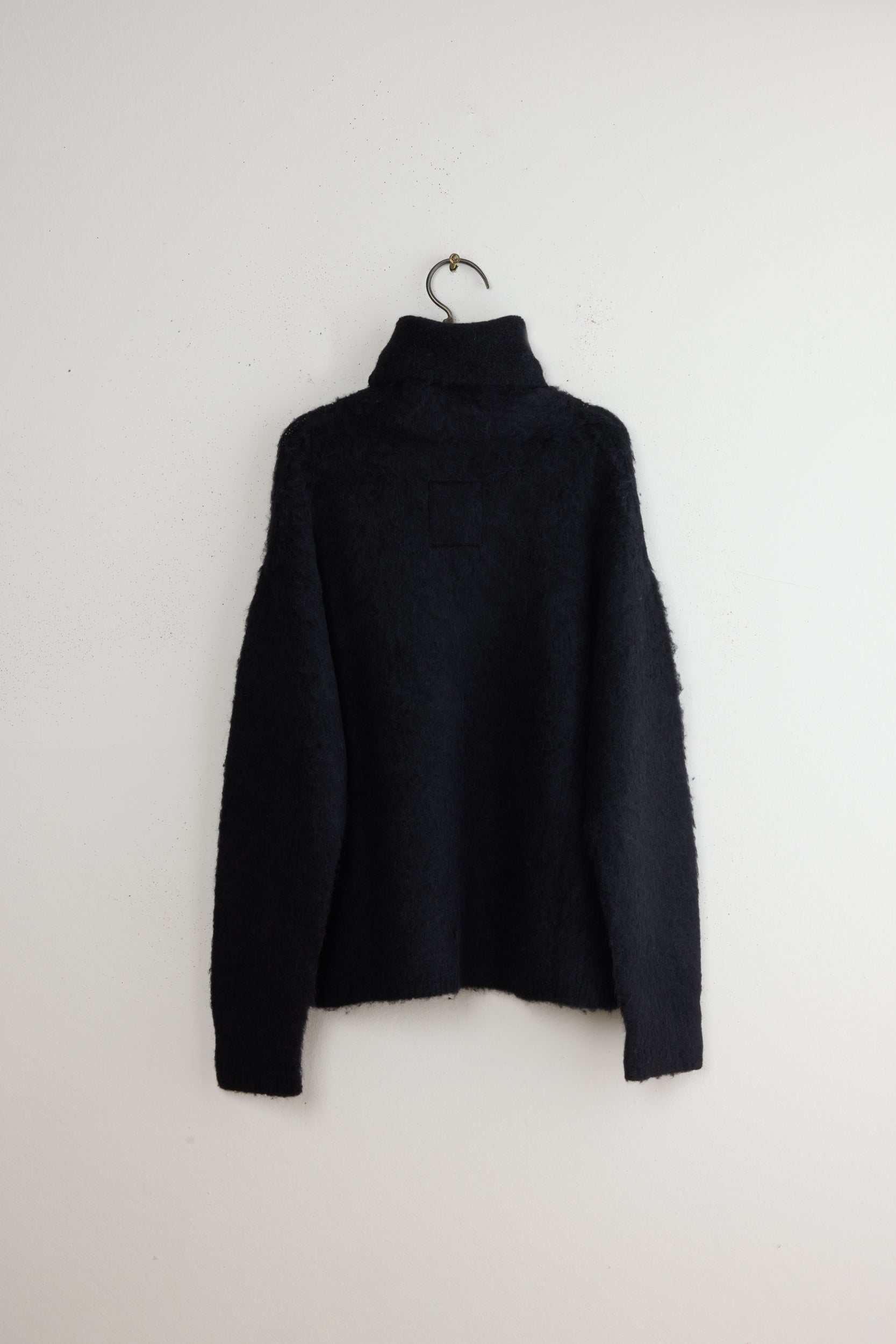Brush HN pullover from house of Chinese designer Uma Wang. A fluffy turtleneck pullover sweater made from a super soft alpaca wool blend. Relaxed fit with high neck and super long sleeves.