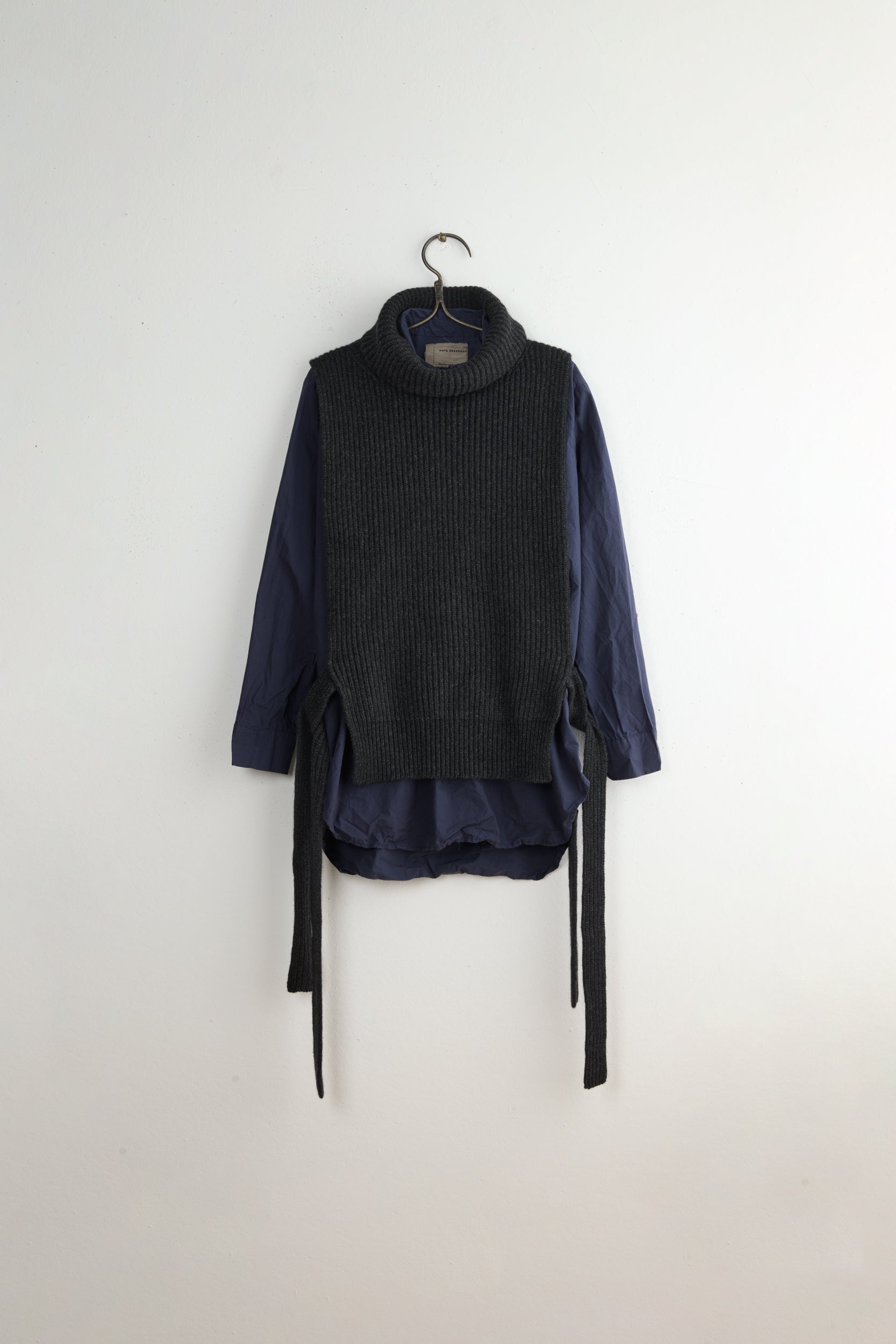 SLV vest by Chinese designer Uma Wang. A soft, cozy knitted vest made from mid-weight ribbed cashmere. Relaxed fit, completely open on the sides, fitted with ties on the sides and a super high turtleneck.