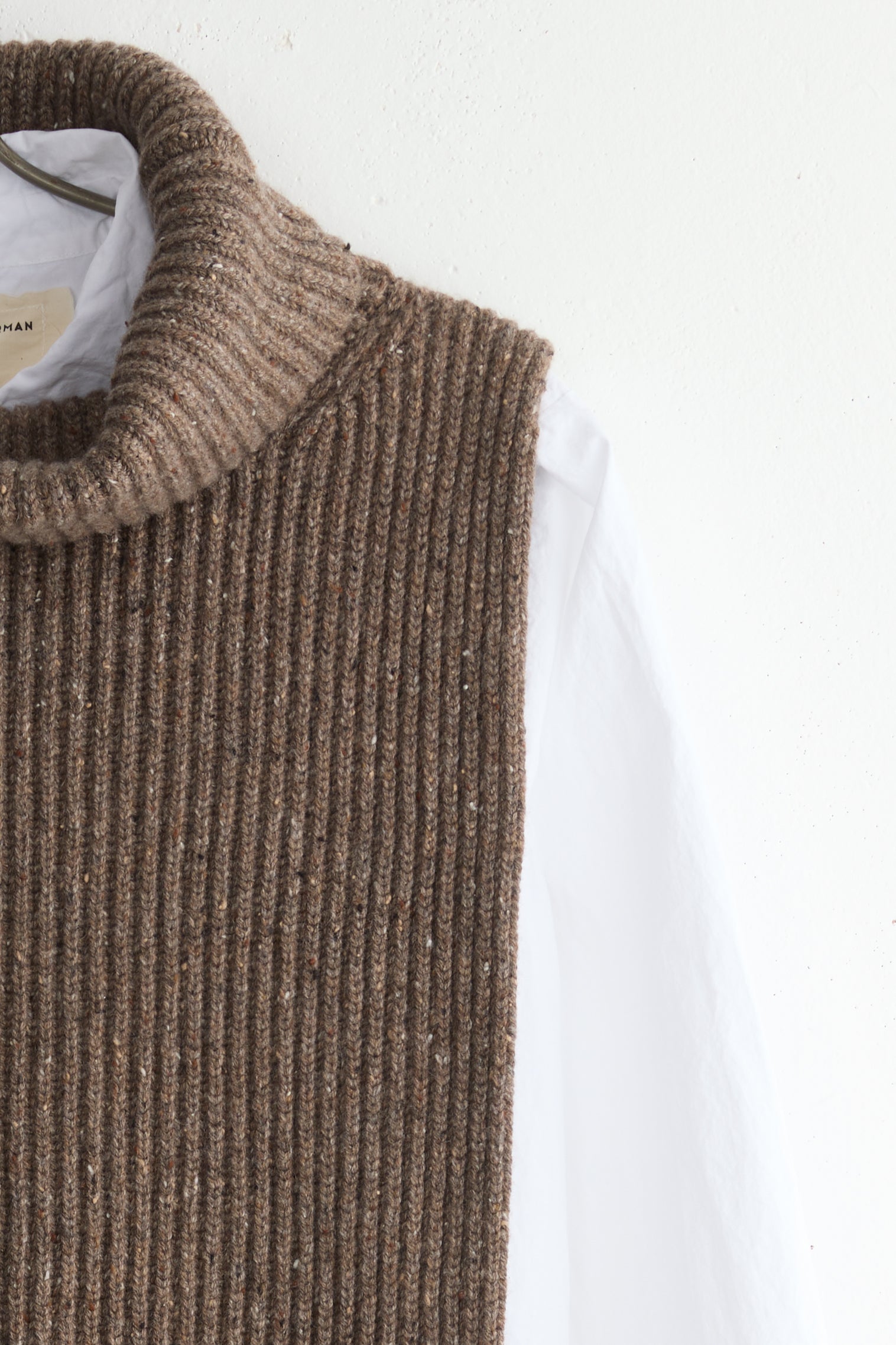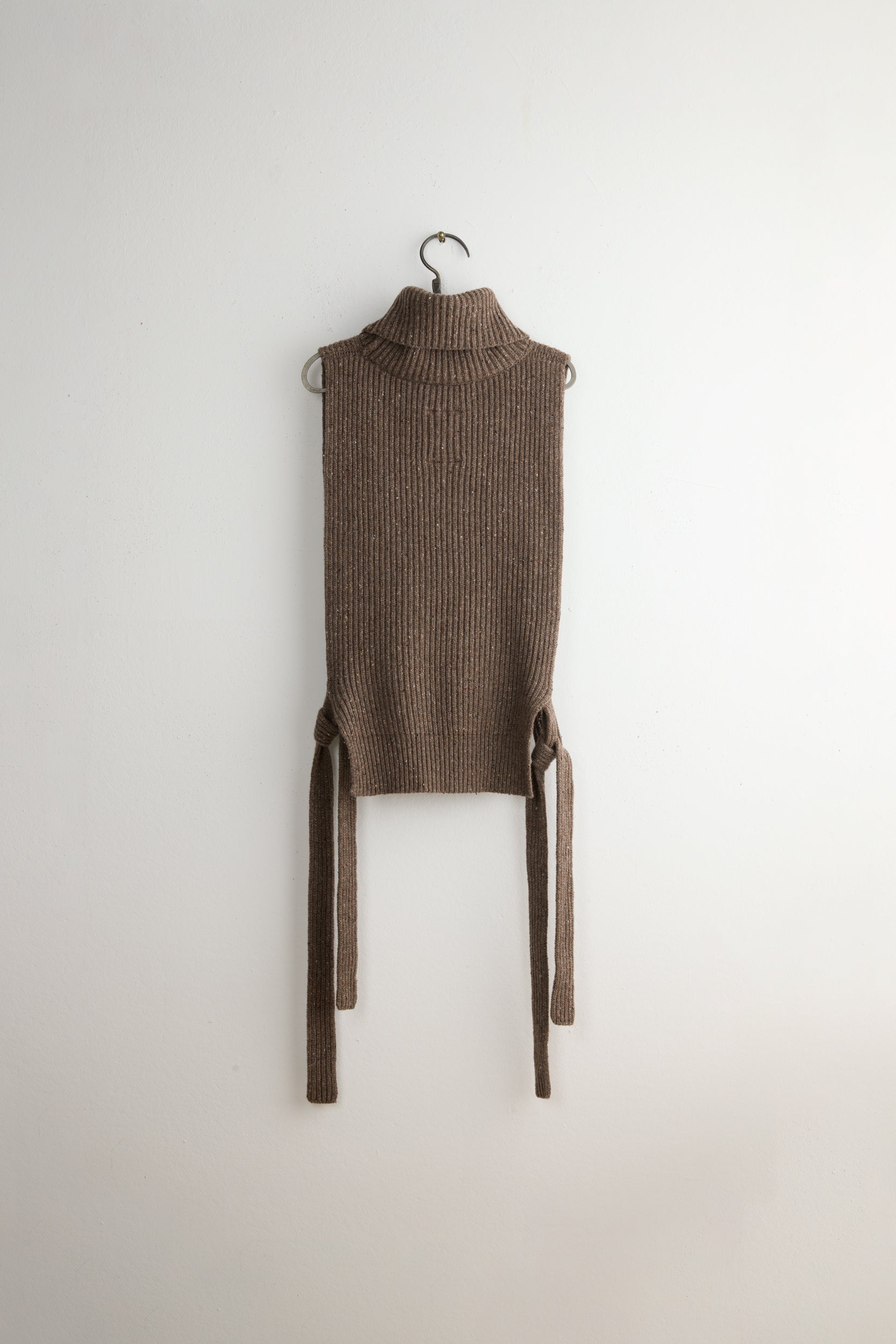 SLV vest by Chinese designer Uma Wang. A soft, cozy knitted vest made from mid-weight ribbed cashmere. Relaxed fit, completely open on the sides, fitted with ties on the sides and a super high turtleneck.