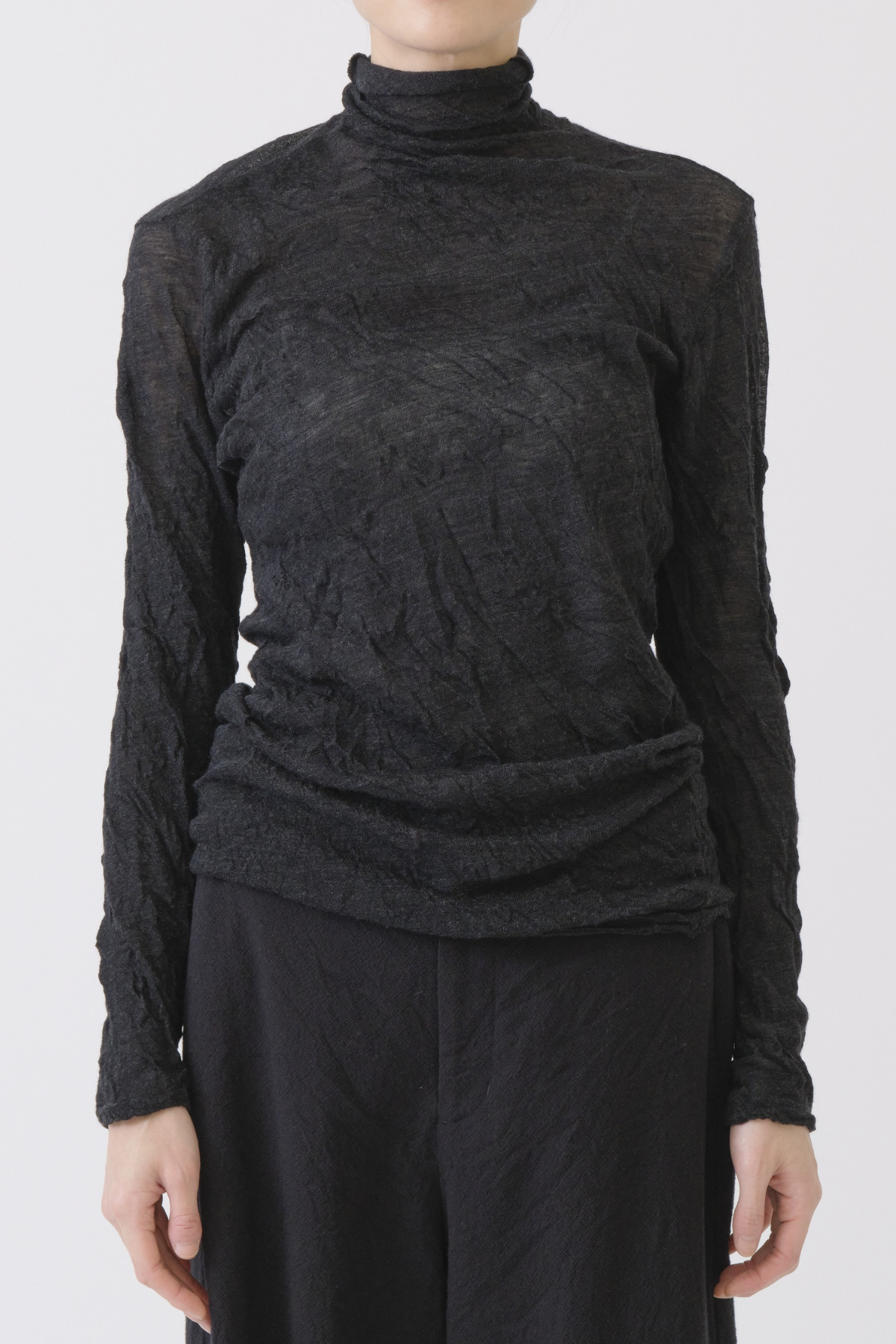 WG crinkle turtleneck pull by Japanese brand Pas De Calais. A classic fitted turtleneck pullover made of a wool gauze jersey with a hand crinkled finish. Classic fitted silhouette with small side slits and slightly longer back side.
