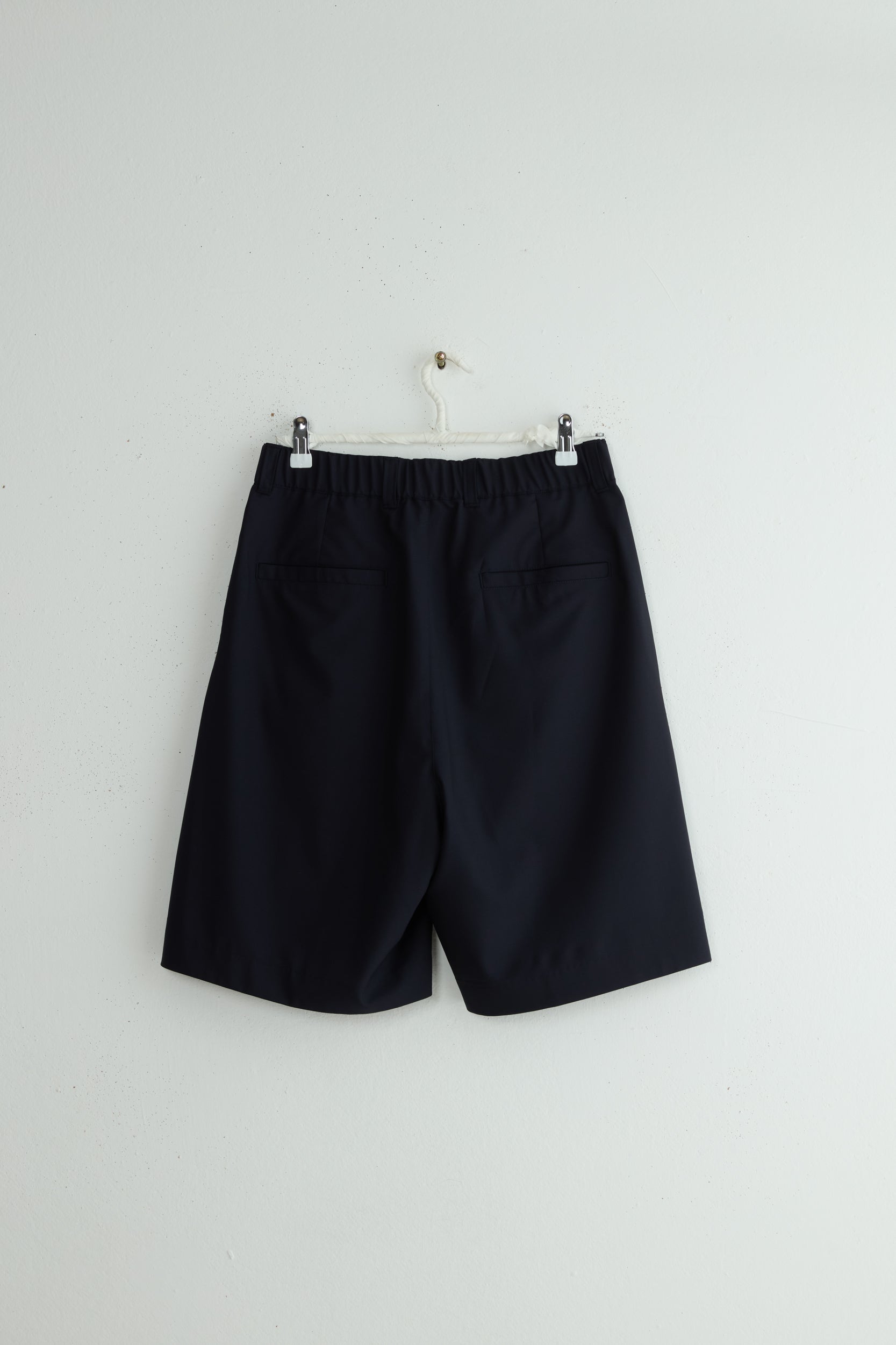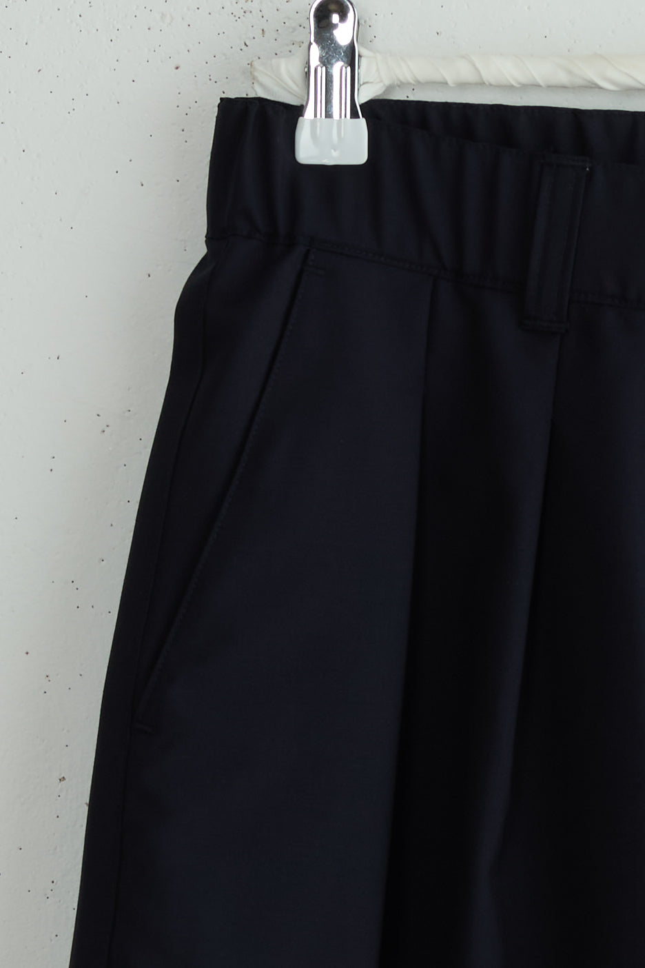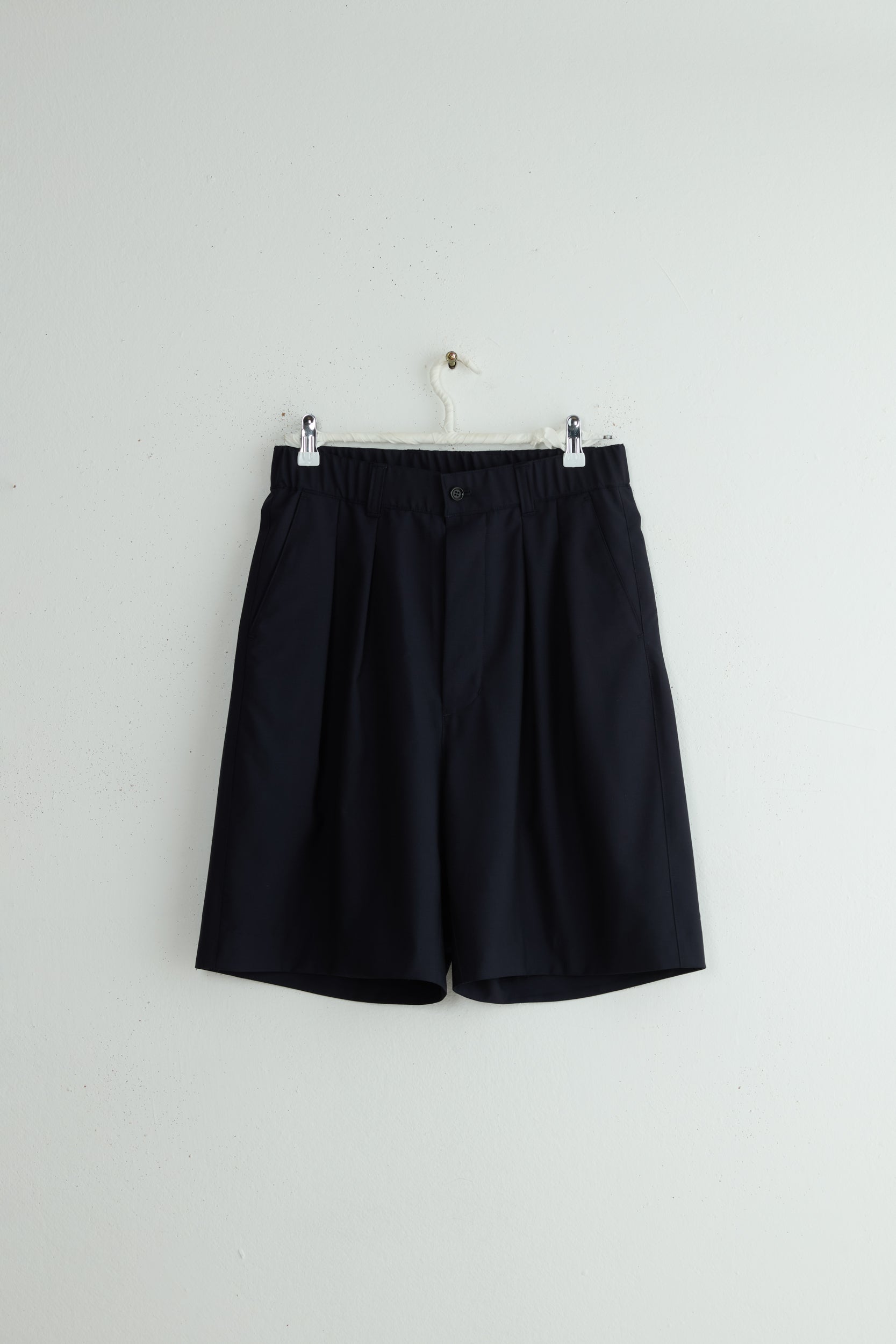 2-in-pleat shorts by TOUJOURS. Light-weight elegant shorts made of silky and breathable tropical wool, which is perfect for summer wear. Relaxed, high rise fit with button closure, elastic waist with belt loops, side slash pockets and back welt pockets. these shorts are wide legged and knee short. The fabric is both wrinkle-resistant and easy to handle, having the deodorizing and antibacterial effects unique to natural materials.