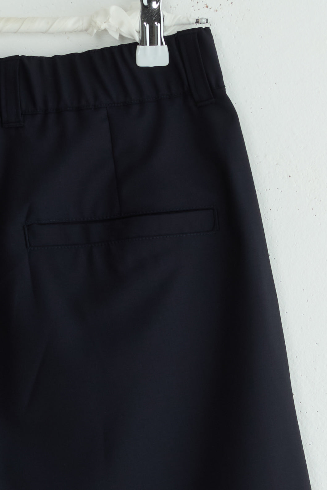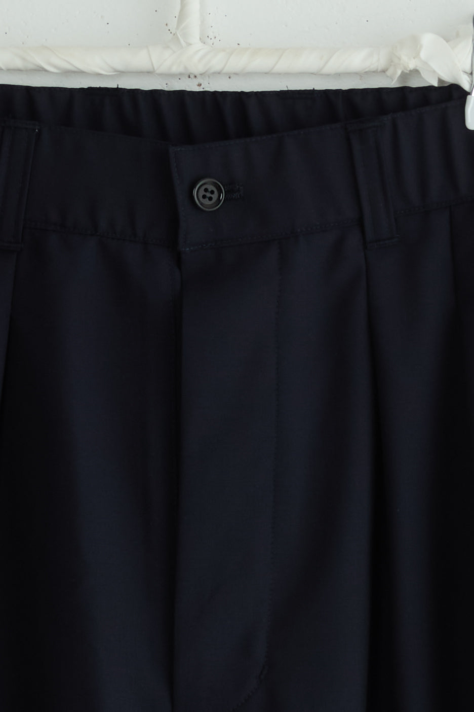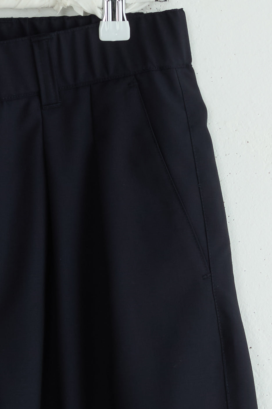 2-in-pleat shorts by TOUJOURS. Light-weight elegant shorts made of silky and breathable tropical wool, which is perfect for summer wear. Relaxed, high rise fit with button closure, elastic waist with belt loops, side slash pockets and back welt pockets. these shorts are wide legged and knee short. The fabric is both wrinkle-resistant and easy to handle, having the deodorizing and antibacterial effects unique to natural materials.