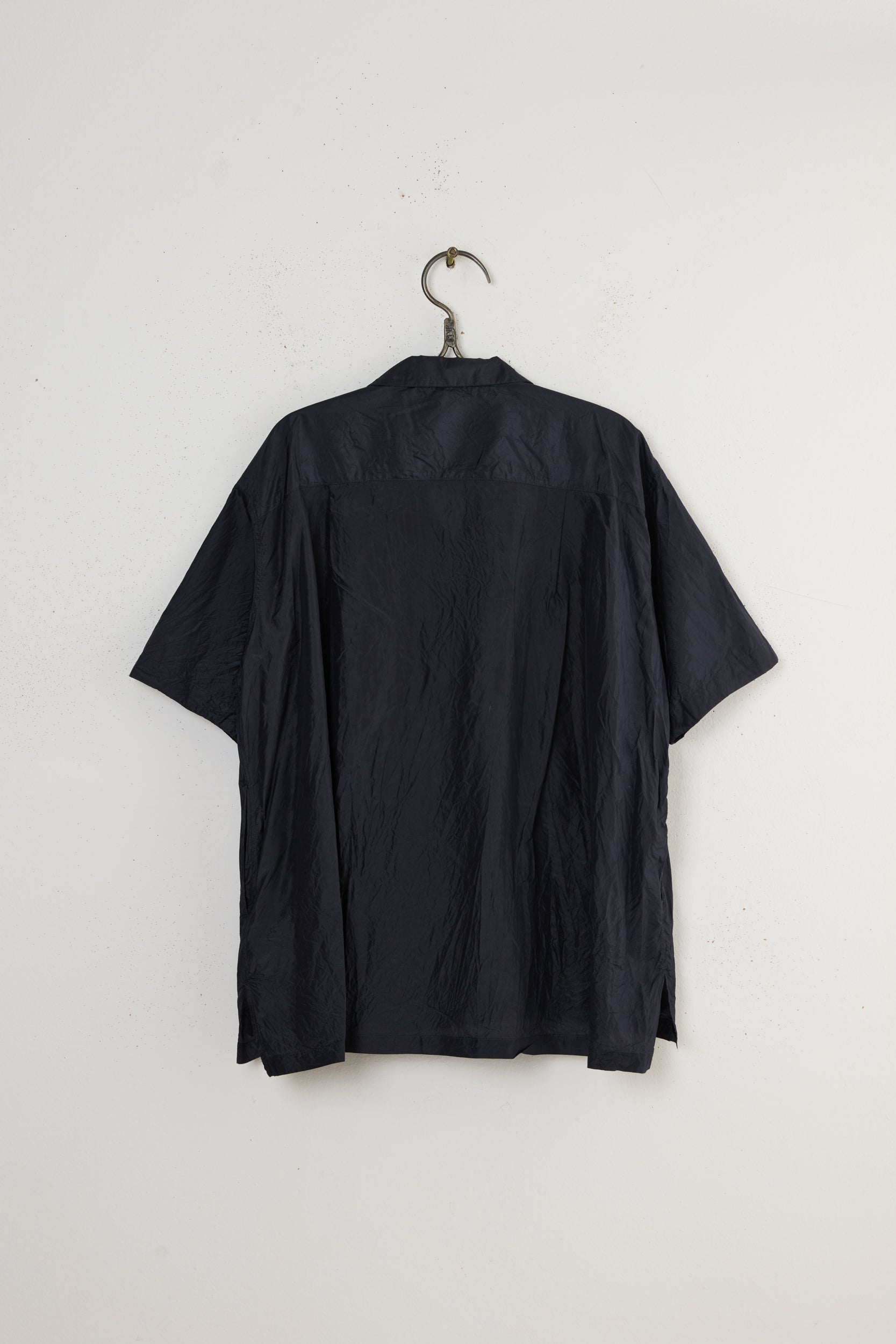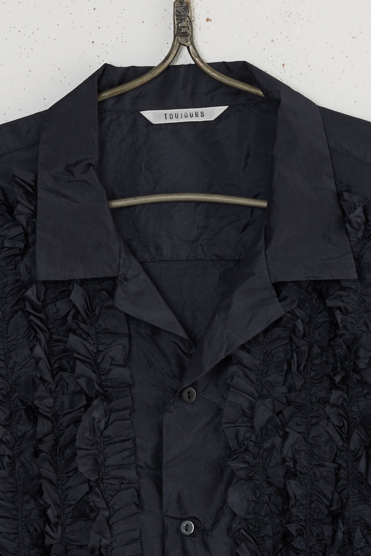 Short sleeve frill shirt by TOUJOURS. A beautiful and delicate buttoned shirt made from high count silk cloth. Relaxed, slightly boxy fit, with elbow length sleeves, an open collar and a frilled front.
